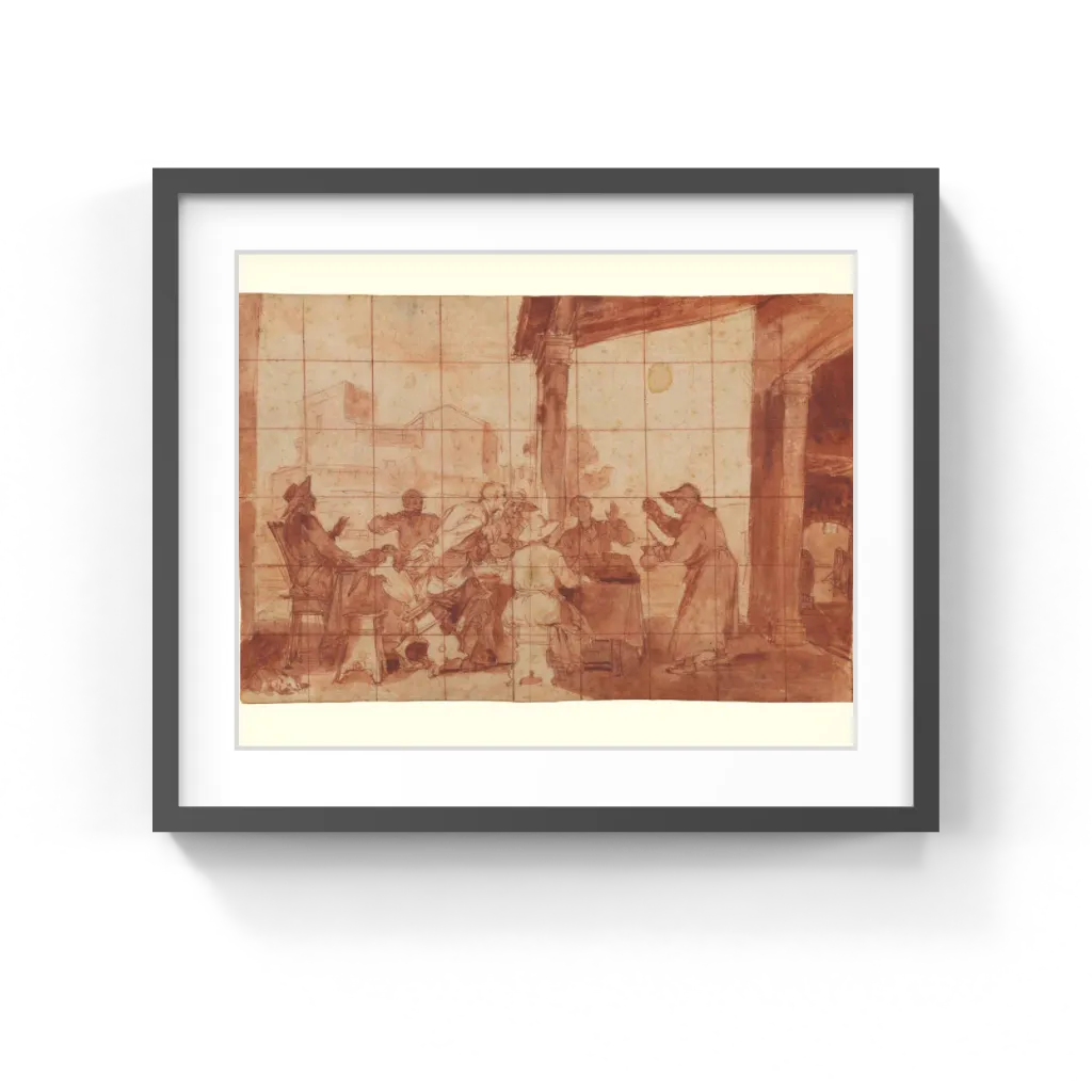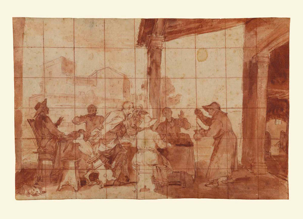 Volterrano (Baldassare Franceschini) (Italian, 1611–1690) Volterrano depicts the priest and notorious prankster Arlotto Mainardi (1396-1488) performing a trick on his companions. They gather around a rustic table under a shady portico, with a sunlit villa in the background. Having been sent to the cellar to draw wine for the meal, Arlotto, anticipating that his share of food would be consumed while he is gone, leaves the barrel spigot open so that wine continues to gush to the floor. On his return, the prankster's upraised fist and playfully severe facial expression elicit varied reactions from the men at the table. Elaborately worked and squared so that it could be copied on to a canvas, the drawing served as a modello for one of Volterrano's most famous paintings, now in the Palazzo Pitti, Florence. The artist's contemporaries so admired the composition that they made numerous copies of it; however, the apparent humor in the scene may be lost on present-day viewers.