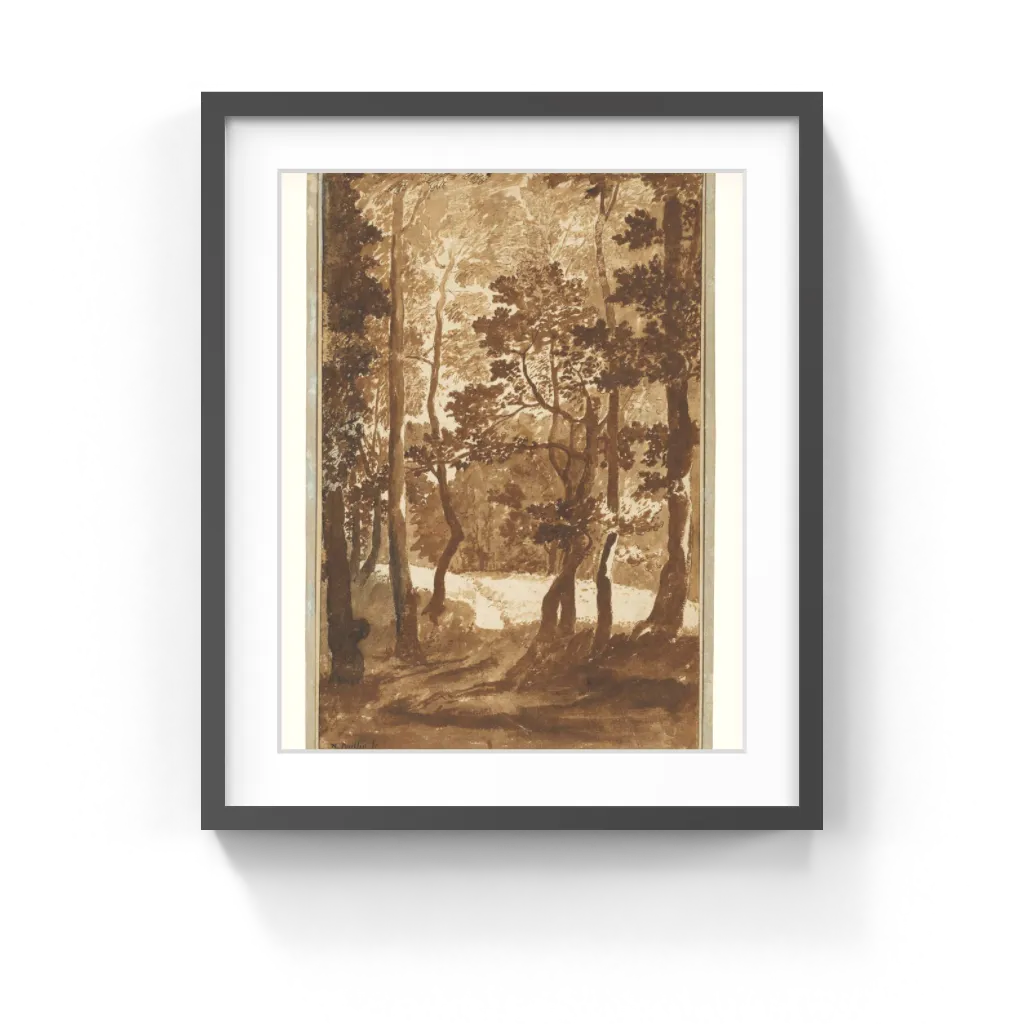 Poussin probably made this view on the spot. He captured the atmosphere of a wooded path opening onto a grassy clearing, with sunlight streaming through a thicket of trees. With vivid touches of his pen and brush, he skillfully suggested the deep shadows on the trunks of the trees and the sunlight penetrating their foliage.