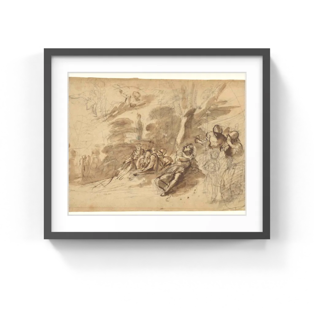 Pier Francesco Mola displayed his distinctive talent for incorporating figures into lush, windswept landscapes that enhance the scene's drama. He usually mixed pen and chalk as he did here, first quickly laying down the composition's essentials using black chalk, then picking out the most important lines in pen and ink. His characteristic fluid dark washes increase the sense of movement and tension.