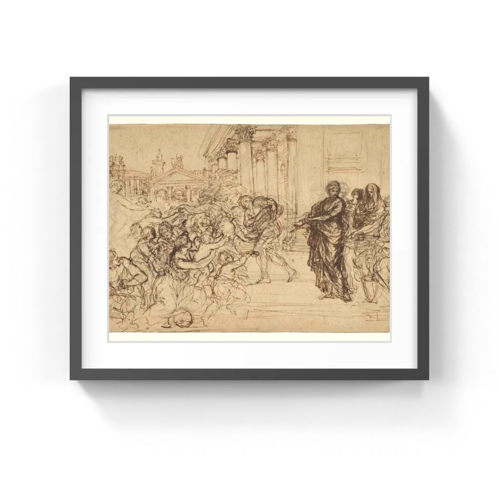 Pietro da Cortona (Italian, 1596–1669) A monumental Saint Cecilia instructs assistants to distribute alms to a crowd. Although Cecilia is the darkest and most worked figure, she does not dominate; she is balanced by the tumultuous crowd.
