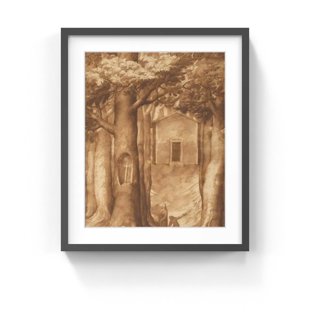 Jacopo Ligozzi (Italian, 1547–1626) Using expressive brown wash punctuated by the bare paper's brilliant white highlights, Jacopo Ligozzi captured one of Catholicism's holy miracles in this characteristically highly finished drawing. Here, Christ appears to Giovanni della Verna under an enormous beech tree at La Verna in the Apennine Mountains. In addition to portraying the tree and foliage in elaborate detail, Ligozzi included in the background the commemorative chapel built where the miracle occurred.