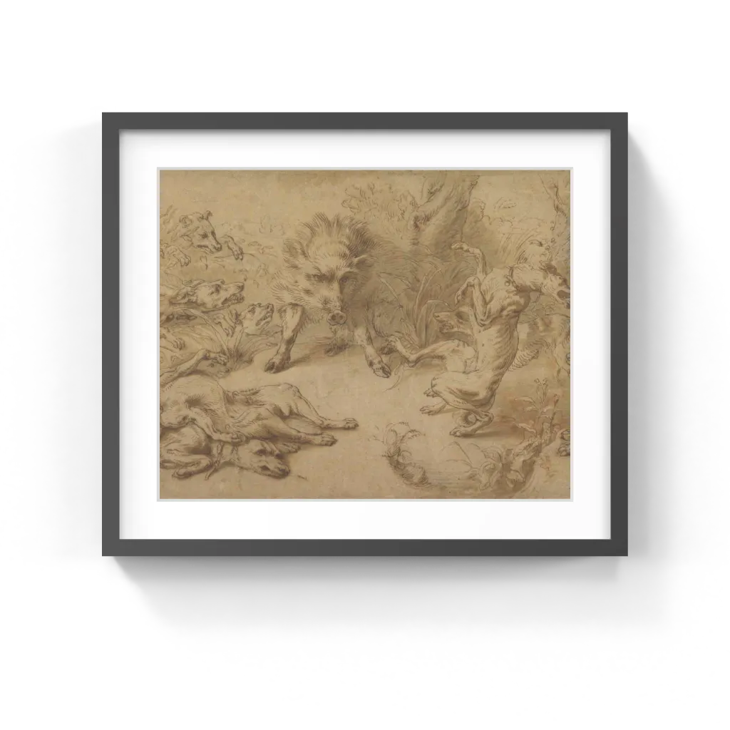 Frans Snyders (Flemish, 1579–1657) Backed snarling against a tree, a wild boar fends off the attacking hounds. The bodies of three dogs lie piled in a heap on the left, while others leap towards the boar. Frans Snyders concentrated particularly on the animals' tormented facial expressions, from the angry stare of the cornered boar to the suffering of the hound on its back to the growling fury of the dogs who attack their prey at the rear. Each is caught in suspended motion, leaping, rushing, and growling. Delicately executed pen and brown ink emphasize the boar's wiry coat, while washes reproduce the dogs' soft fur and the fine tufts of undergrowth at the back.