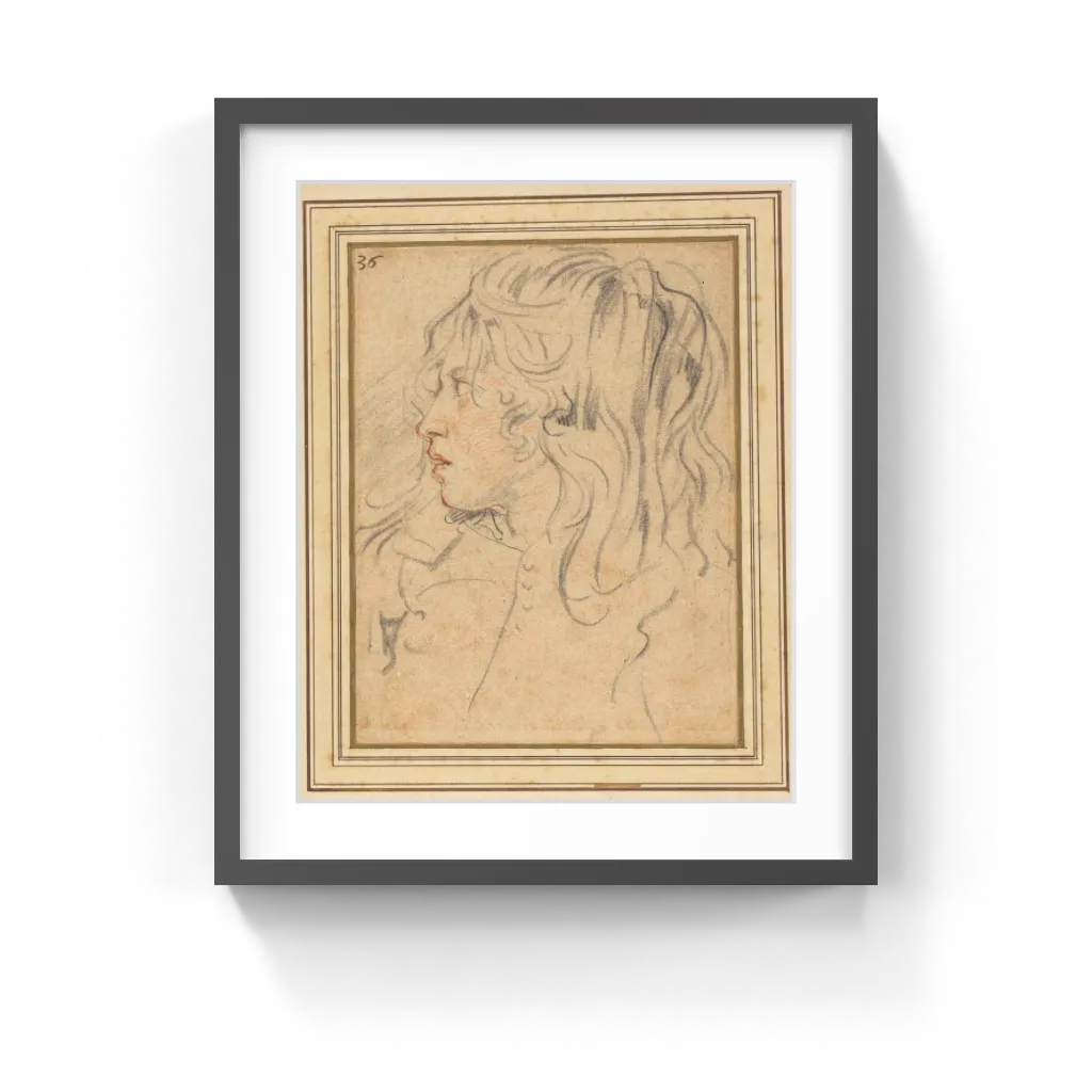Jan Cossiers (Flemish, 1600–1671) Jan Cossiers probably drew this portrait sketch of his son Cornelis from life. He quickly captured the tilt of his son's head as he stares fixedly over his right shoulder. Loose, flowing strokes capture his strong profile, slightly open mouth, and tousled, shoulder-length hair. Black chalk delineates the boy's features, such as the hair, upturned nose and prominent upper lip, while subtle touches of red chalk describe the flesh tones.