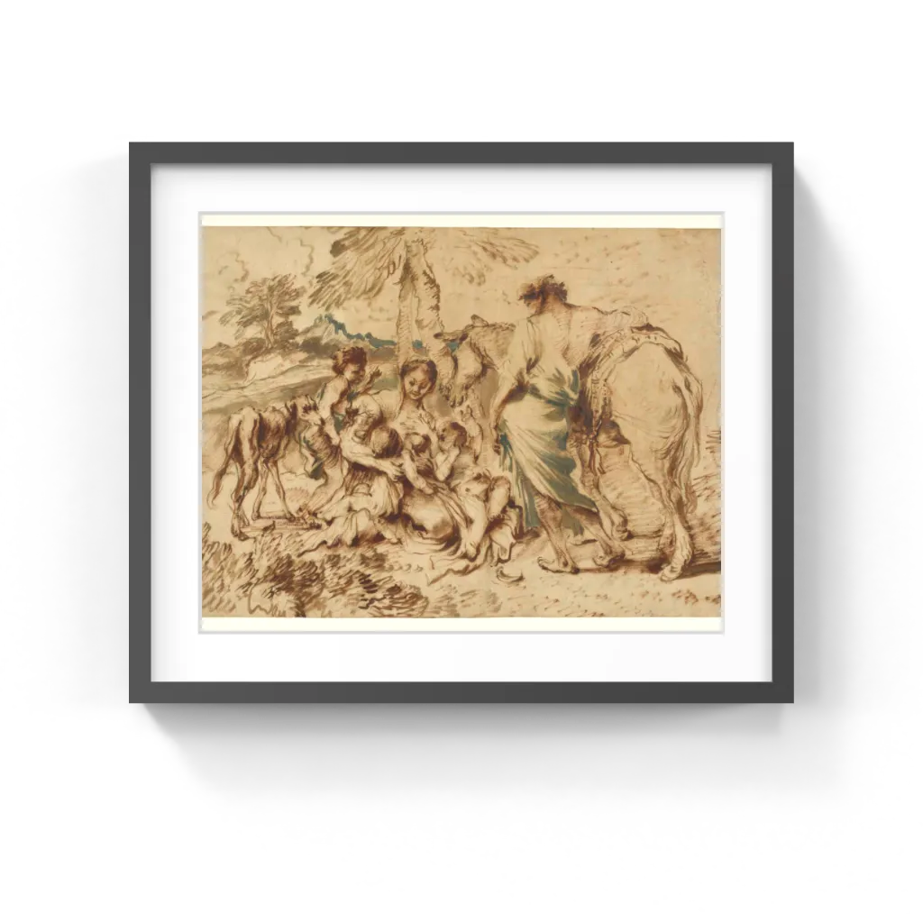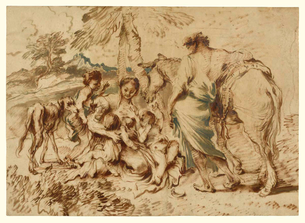 Giovanni Benedetto Castiglione (Italian, 1609–1664) In making this drawing, Giovanni Benedetto Castiglione may have originally intended to illustrate a Biblical scene, such as the flight of Mary and Joseph to Egypt. Instead he produced an entirely new type of pastoral subject: a young mother seated on the ground nursing her children. She is noticeably at home amidst the animals and the surrounding landscape. A classically posed male figure, presumably the father, casually leans on his horse, looking toward his family. The lazy-looking dog to the left of the composition is a stock figure that appears in some of the artist's other drawings. Castiglione conceived of this unusually large drawing as an independent work of art, and employed his characteristic, vigorous brushstrokes to convey a sense of vitality.