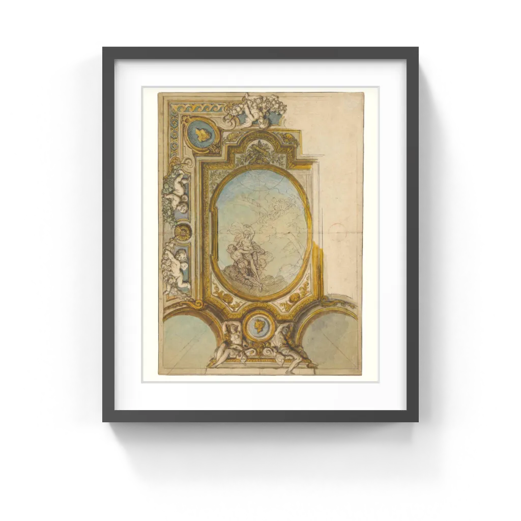 Charles de La Fosse (French, 1636–1716) In the central oval of this elaborate design for a ceiling, a loosely sketched couple wrestles among the clouds while other figures watch above them. Charles de la Fosse quickly sketched the central mythological scene but focused most of his attention on the surrounding decoration. Along the border and frame, he showed various options for ornamental motifs that a patron could choose, such as putti holding garlands or draped female figures, portrait medallions or rosettes, and scrolling. The decoration, once the ceiling was built, would have been symmetrical; this drawing allowed the artist to help the patron understand his or her choices.