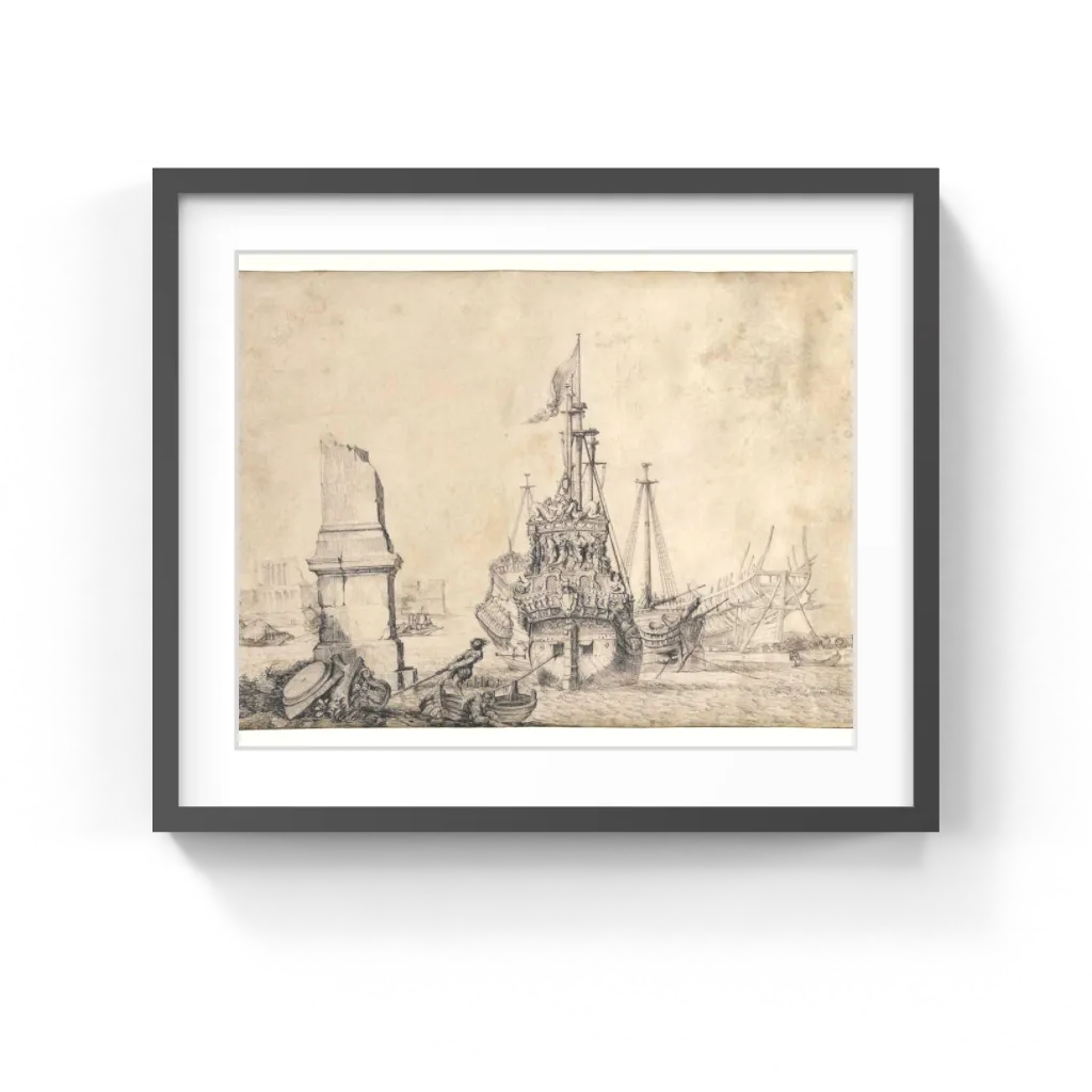 Pierre Puget (French, 1620–1694) Throughout his life, Pierre Puget expressed a fascination with ships and marine life, probably due to the fact that he was born and raised in the French port city of Marseilles. This detailed drawing of ships in a port is no exception. Here, two deckhands struggle to tether a large vessel, using fragments of a ruined pillar nearby. Another ship sits at anchor in the middle distance, and a half-finished hull is dry-docked to the right. Classical ruins incongruously decorate the far and near shores of the inlet.