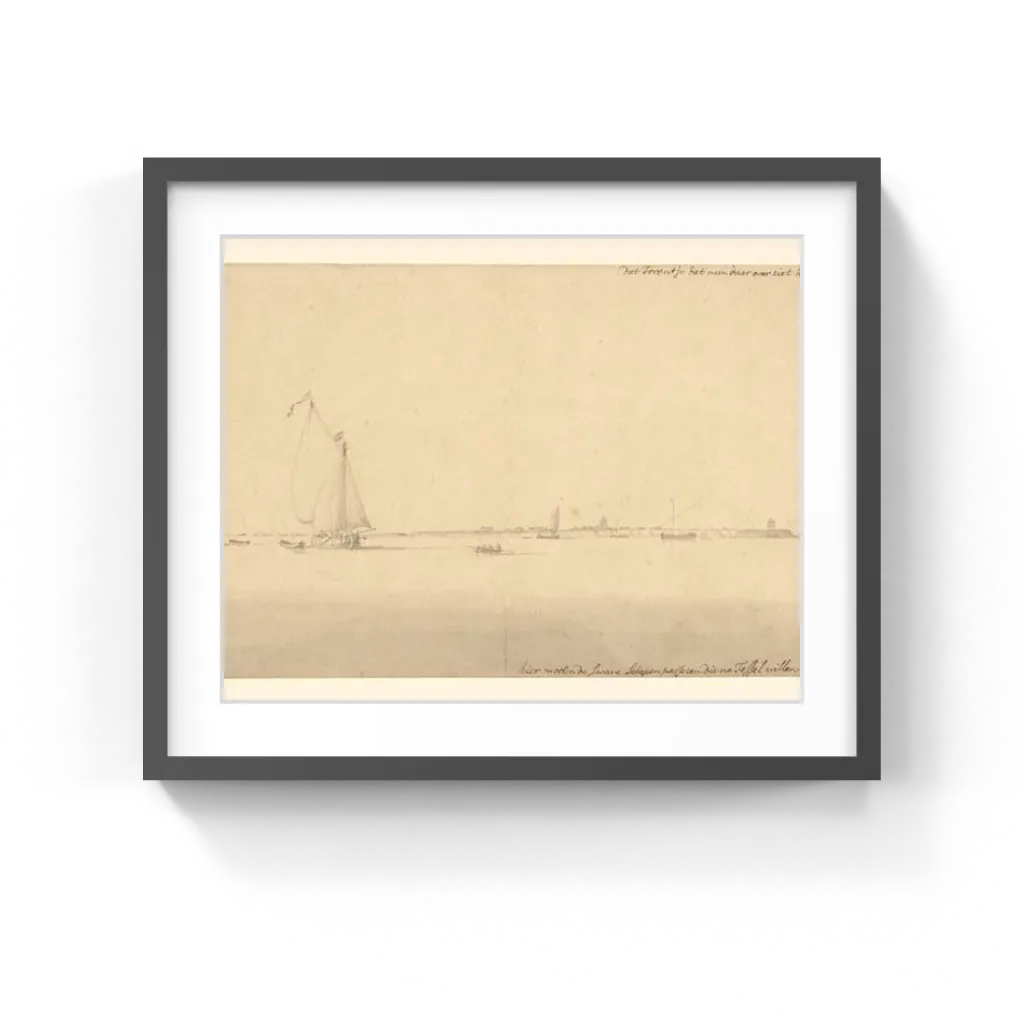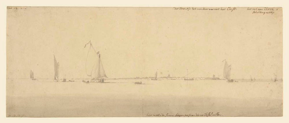 Willem van de Velde the Younger (Dutch, 1633–1707) During the Dutch Golden Age, the River Ij provided access to merchant vessels traveling between Amsterdam and the North Sea. In this panoramic view, tall sails and a distant city skyline animate a thin horizon line that separates sky from water. A dark band of wash near the bottom of the page conveys the water's depth and expanse.