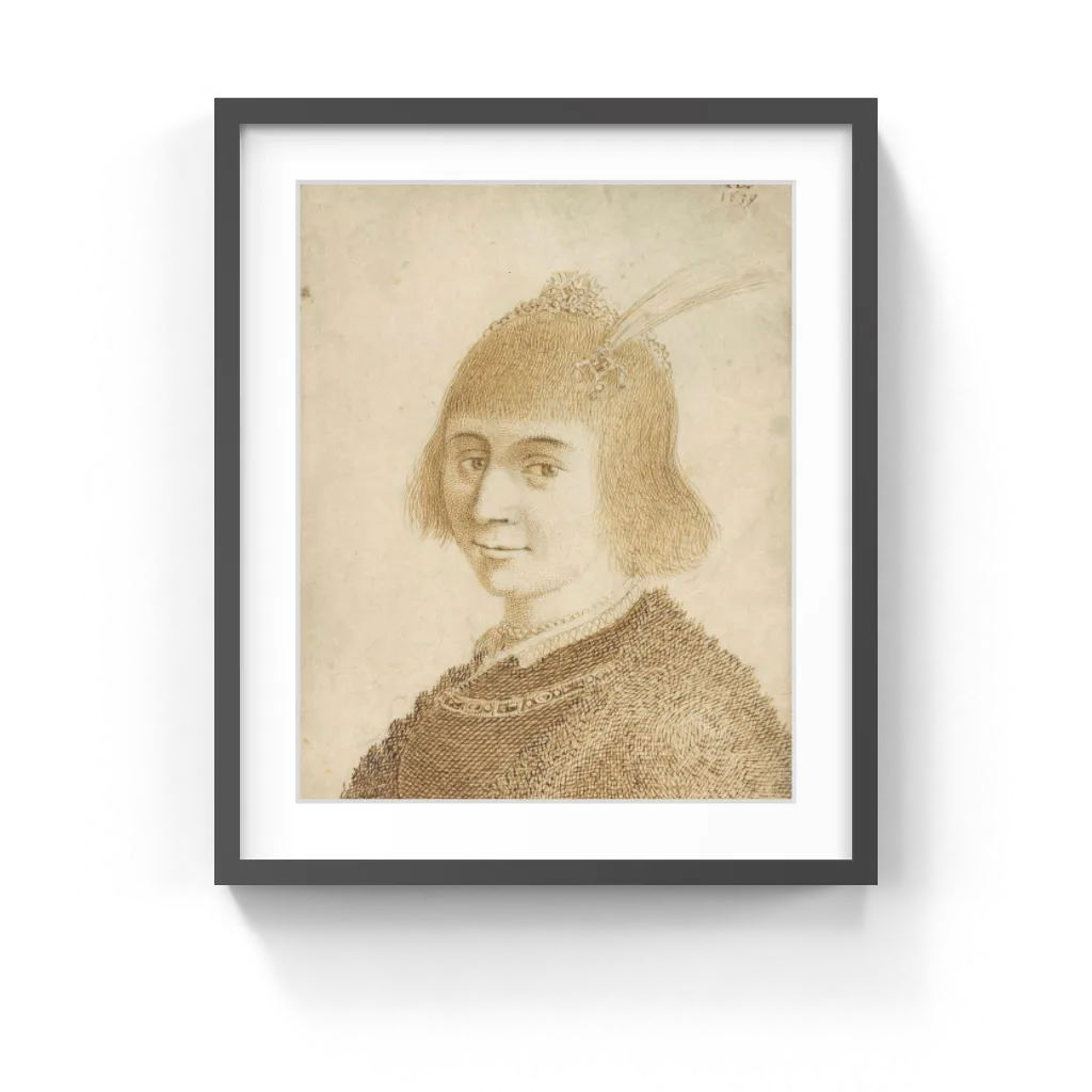 Jan van de Velde (Dutch, 1593–1641) The identity of the sitter of this bust-length portrait is unknown but her costume indicates that she was a woman of considerable wealth. She wears a dark bodice, trimmed at the neck with a lace ruffle and a fur cape complemented by a fine necklace. An ornate headdress and, above her right temple, a jeweled pin with a plume of osprey feathers, complete her ensemble. Although formally attired, the young woman shows a slight smile and subtly tilts her head.