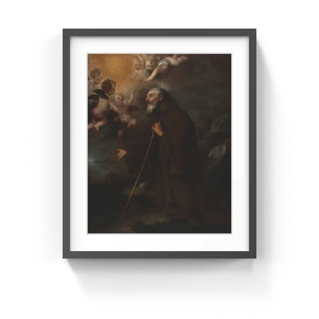 The subject of the painting should not be considered simply in terms of its visionary and narrative elements, but as a representation of faith itself as embodied by Saint Francis of Paola. Elderly and bearded, he is humbly dressed and appears to bear the weight of his calling on his slender walking staff. He gazes at the message borne aloft by the heavenly host with a look of reverent awe and dutiful acceptance. The simplicity of setting, sober tonality, loose brushwork, and harmony of both material and divine presence, are all consistent with Murillo's late style and help to convey a scene of passionate spiritual appeal.