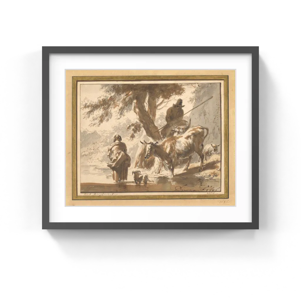 Nicolaes Berchem (Dutch, 1620–1683) A man and woman lead their herd across a shimmering ford. The woman has already entered the shallow water and hikes up her skirt. A hefty cow tentatively dips its front hooves into the water. The hatted herdsman brings up the rear with a long stick in his hand. The group's movement is anchored around a pair of large trees that cross at the center of the composition.