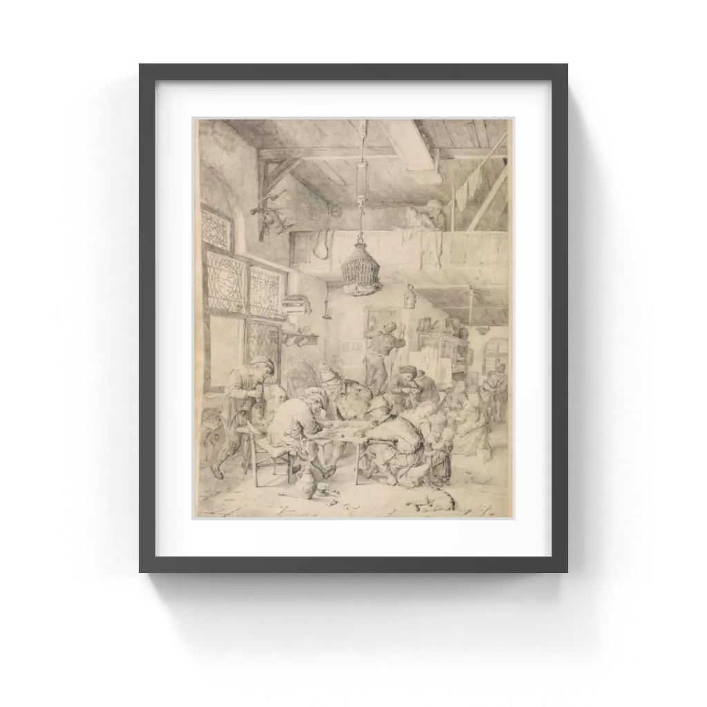 Cornelis Dusart (Dutch, 1660–1704) The delicate draftsmanship in this drawing forms an interesting contrast to a coarse subject: a tavern in which peasants engage in bawdy behavior. A handful of rough looking men gather to play backgammon, while others sit around, immensely enjoying their smoking tobacco. Men, women, and even children drink beer. Couples fondle one another in the more secluded spaces of a corner or balcony.