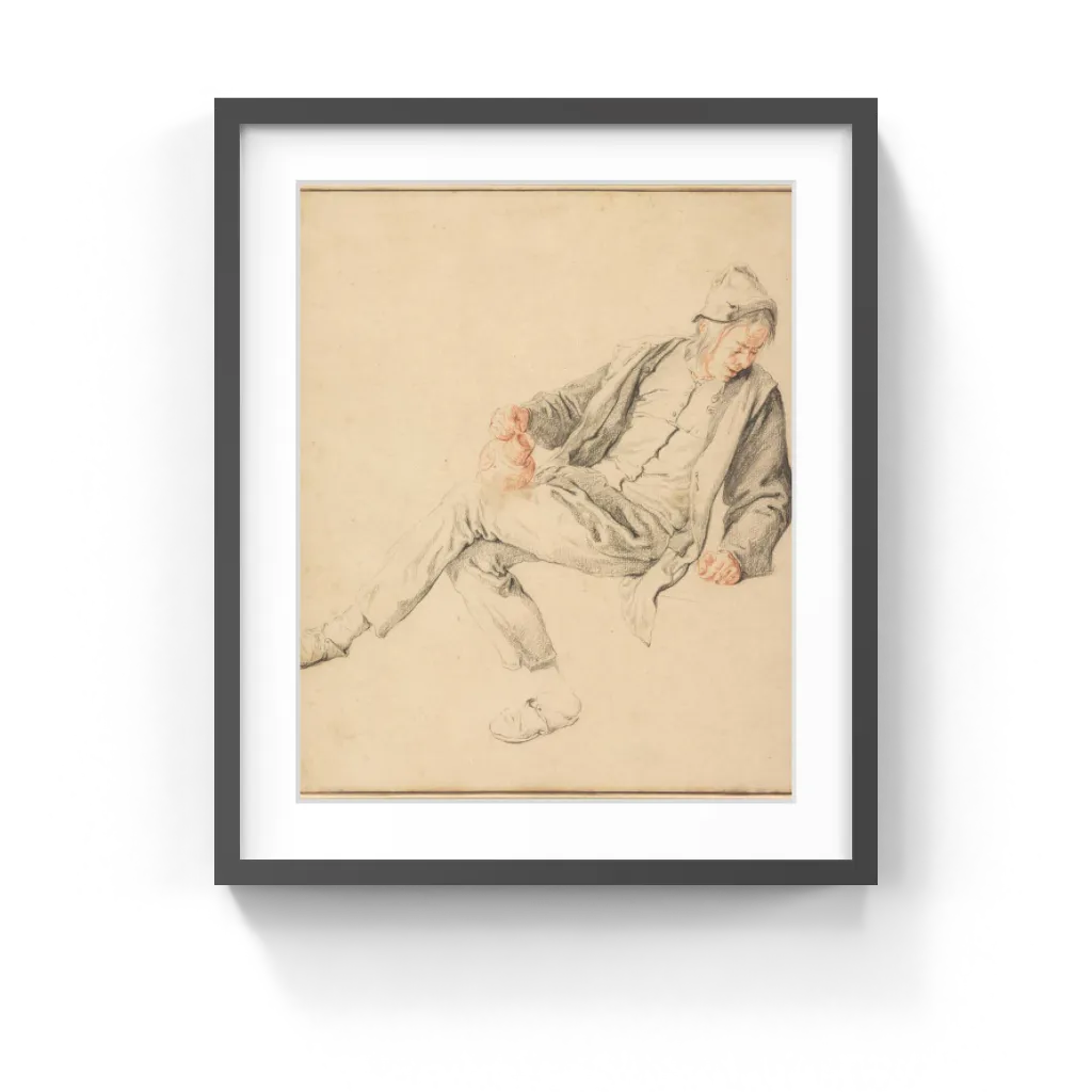 Continuing the genre tradition established by his teacher Adriaen van Ostade, Dusart specialized in depictions of peasant life. Like Van Ostade, Dusart produced studies exploring variations in pose and expression of single, seated figures. But the use of red chalk--often highlighting hands and face--was Dusart's own innovation.