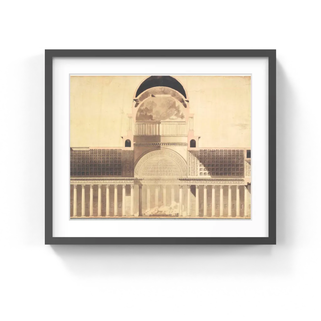 Etienne-Louis Boullée (French, 1728–1799) Étienne-Louis Boullée illustrated his love of pure geometrical solids in this design for part of a Neoclassical church: the spherical dome rests on the crossing of two cylindrical barrel vaults supported by an arcade of regularly spaced Corinthian columns. Classical details abound: coffering adorns the vaults, figurative sculptures fill niches in the wall, and tiny figures in togas carry fiery torches up to a pagan altar that belches smoke through the sacred space. Because of its expense and the impracticality of its vast size, this ambitious plan for the church of the Madeleine in Paris was never executed.