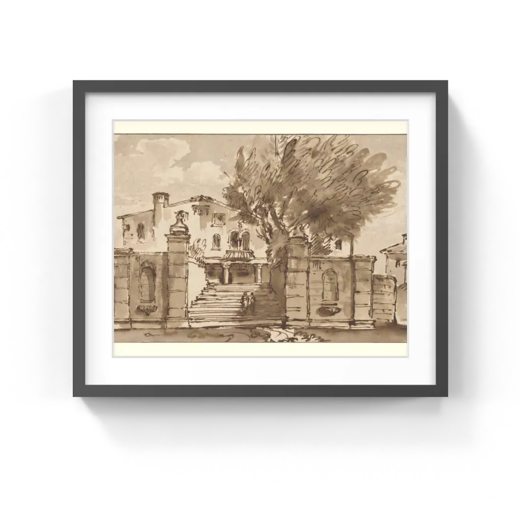 Instead of architectural accuracy or detail, Tiepolo explored light, tone, and texture. Clouds cast shadows on the sunlit building, and even the golden brown shadows on the stone outer wall are suffused with light, but the exact building cannot be identified. To render the quickly sketched large tree, which acts as a foil for the great mass of this typically Venetian villa, Tiepolo adopted Guercino's dynamic chiaroscuro effects.