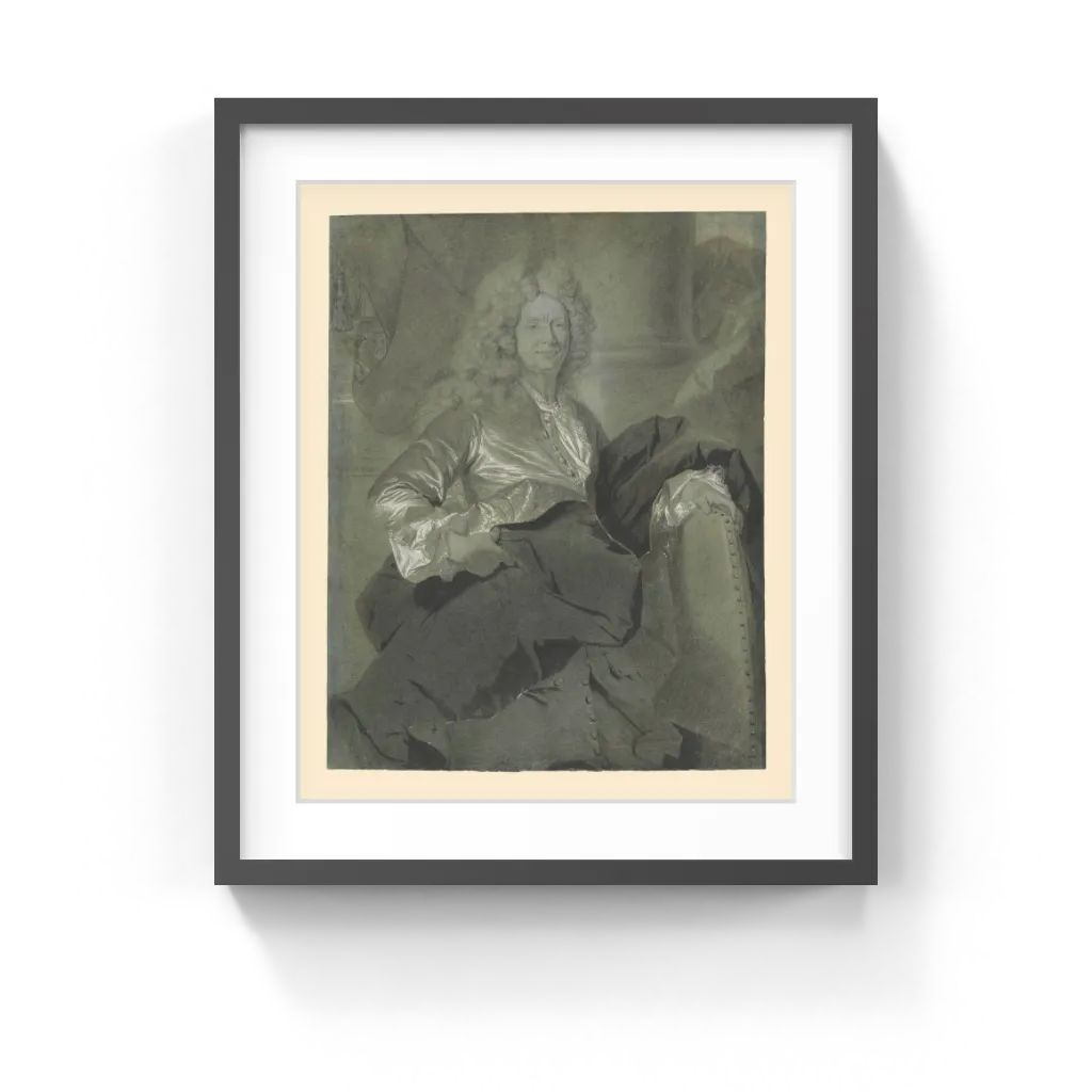 Hyacinthe Rigaud (French, 1659–1743) His subjects' rank and social position interested Hyacinthe Rigaud more than each individual's character. In this drawing of a wealthy nobleman, Rigaud concentrated on the luxurious sheen of his satin coat, the delicate lace frothing around his throat and cuffs, and the damask lining of his cloak, which surrounds him like a cloud. Subtle highlights even pick up the gleam of the brass studs decorating the chair underneath his left hand. Rigaud achieved these effects by applying a layer of white gouache on top of the black chalk and gray wash, creating a gleaming, three-dimensional effect. In contrast, the man's face and luxuriant flowing wig appear flat and static.