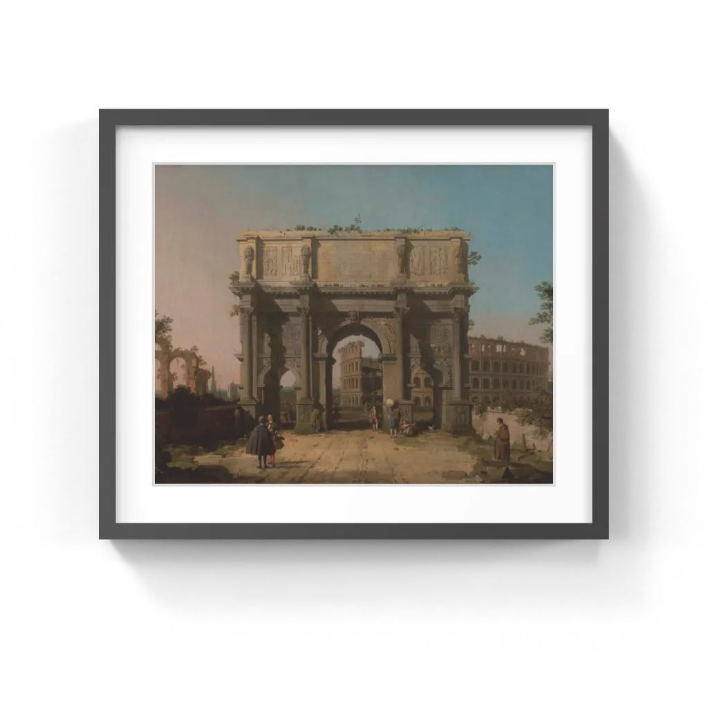 Seen through the central bay of the Arch of Constantine is the Colosseum, which Canaletto shifted to the left in the interests of compositional design. Figures converse, stroll, or carry out daily chores in the vicinity of these ancient buildings. To the left, a lone man sits on ruins with his back to the viewer, perhaps sketching or writing. Wealthy tourists and their servants laden with goods contrast with the poor Roman natives who have nothing, such as the woman who lies against the Arch or the man with a cane at the right. In this painting, Canaletto seems to remark on the gulf between Rome's ancient glory and the city's current impoverished state.
