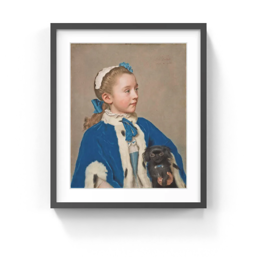 Jean-Étienne Liotard (Swiss, 1702–1789) Changing attitudes towards children and the emergence of a large middle class in eighteenth-century Europe increased the demand for portraits of children such as this one. Maria Frederike, the seven-year-old daughter of an aristocratic Dutch family, looks off to the side in a three-quarter view. Lost in thought, she is composed yet somewhat shy in comparison to her dog, who stares out with unabashed curiosity. With startling naturalism, Jean-Étienne Liotard captured her youth and beauty, setting off her eyebrows, lashes, and lustrous hair against her soft, fresh complexion.