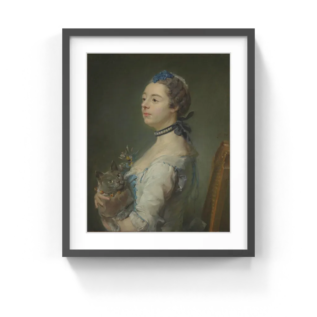 With both hands, Magdaleine grasps a large gray-blue cat that bemusedly engages the viewer. Because of its large size and distinctive coloration, the cat can be identified as a chartreux, one of the oldest and most cherished French breeds. Jean-Baptiste Perronneau included feline companions in several of his portraits of female subjects, reinforcing the elegance and sophistication of his sitters. Here, the bells on the chartreux's collar echo the pearls around Magdaleine's neck, suggesting that cat and sitter alike are refined objects for visual delectation.