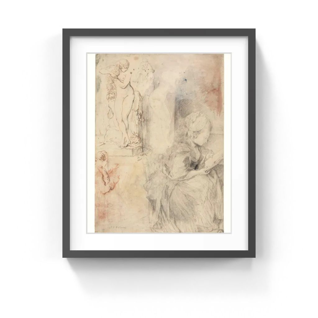 Birth of Venus, a drawing after a contemporary sculpture in the upper left, and a seated woman reading in the lower right--are joined by two fascinating characters. A black-chalk drawing of a seated writer appears to float between the two larger sketches of the