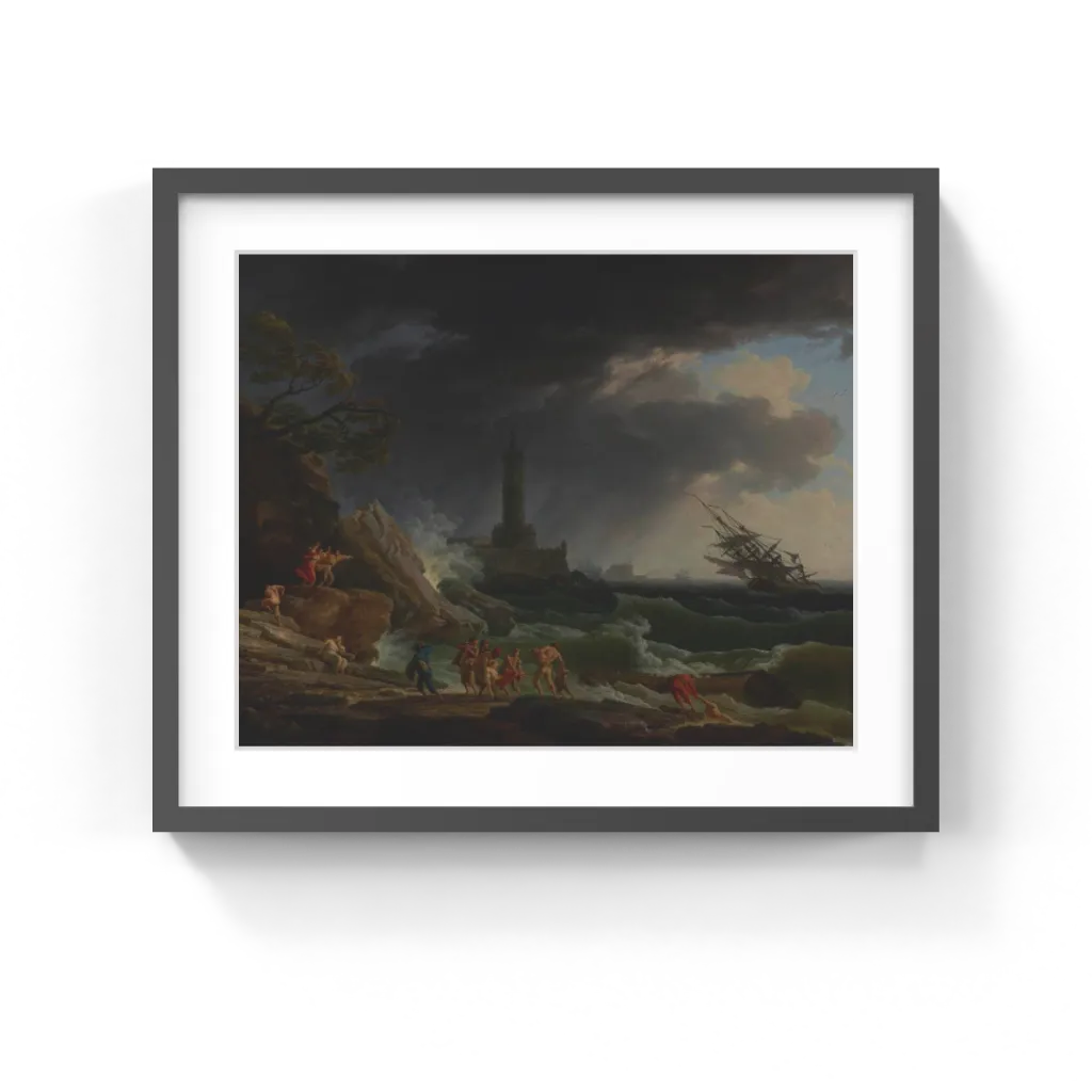Claude-Joseph Vernet (French, 1714–1789) Claude-Joseph Vernet depicted a storm's aftermath: dark clouds above an angry sea, a shipwrecked boat and its anxious survivors, and listing ships in the distance. As the sea furiously beats against the shoreline, waves explode beyond the rocks in a froth of white. The motion of the waves, the distant rain shaft, the battered ship, and even the bodies of the fleeing castaways fill the scene with strong, opposing diagonal lines. The lighthouse standing solidly upright at the painting's center counters all of this activity.
