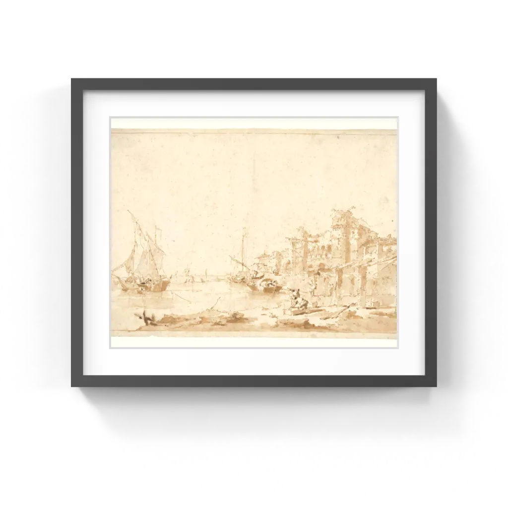 capriccio, an imaginary view that was popular in Italy in the 1700s, and Guardi created many similar imaginary scenes of Venetian life. This scene is rendered in light brown tones, with both pen and ink, with wash. The shoreline is accented with white highlights. The combination of hazy brown shading and placid water gives the impression of a summer evening, just before sunset.