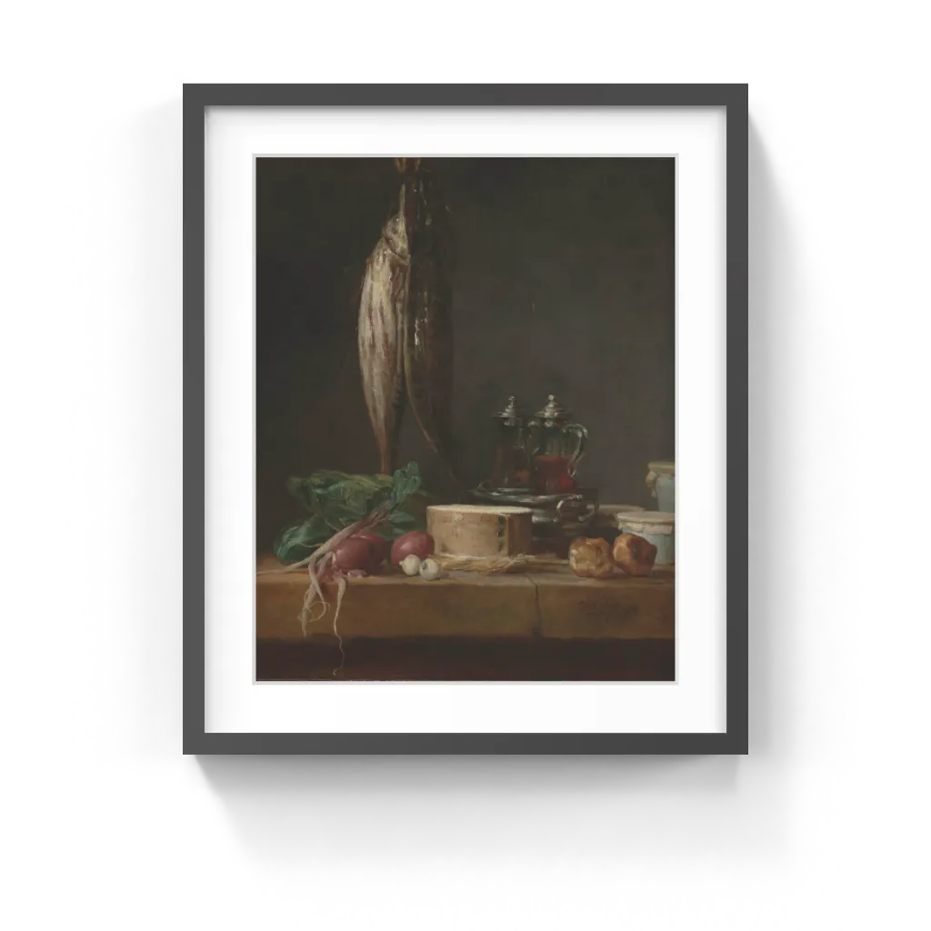 background, perpendicular to an arrangement of food on the tabletop below. Brilliant light directs the eye, attracting attention to the shiny fish, leafy greens, root vegetables, a wheel of cheese, and covered bowls. Although the overall palette is subdued, the oil and vinegar cruets are infused with rich color. The signature and date in the lower right corner are the last Chardin is known to have applied to a still life.