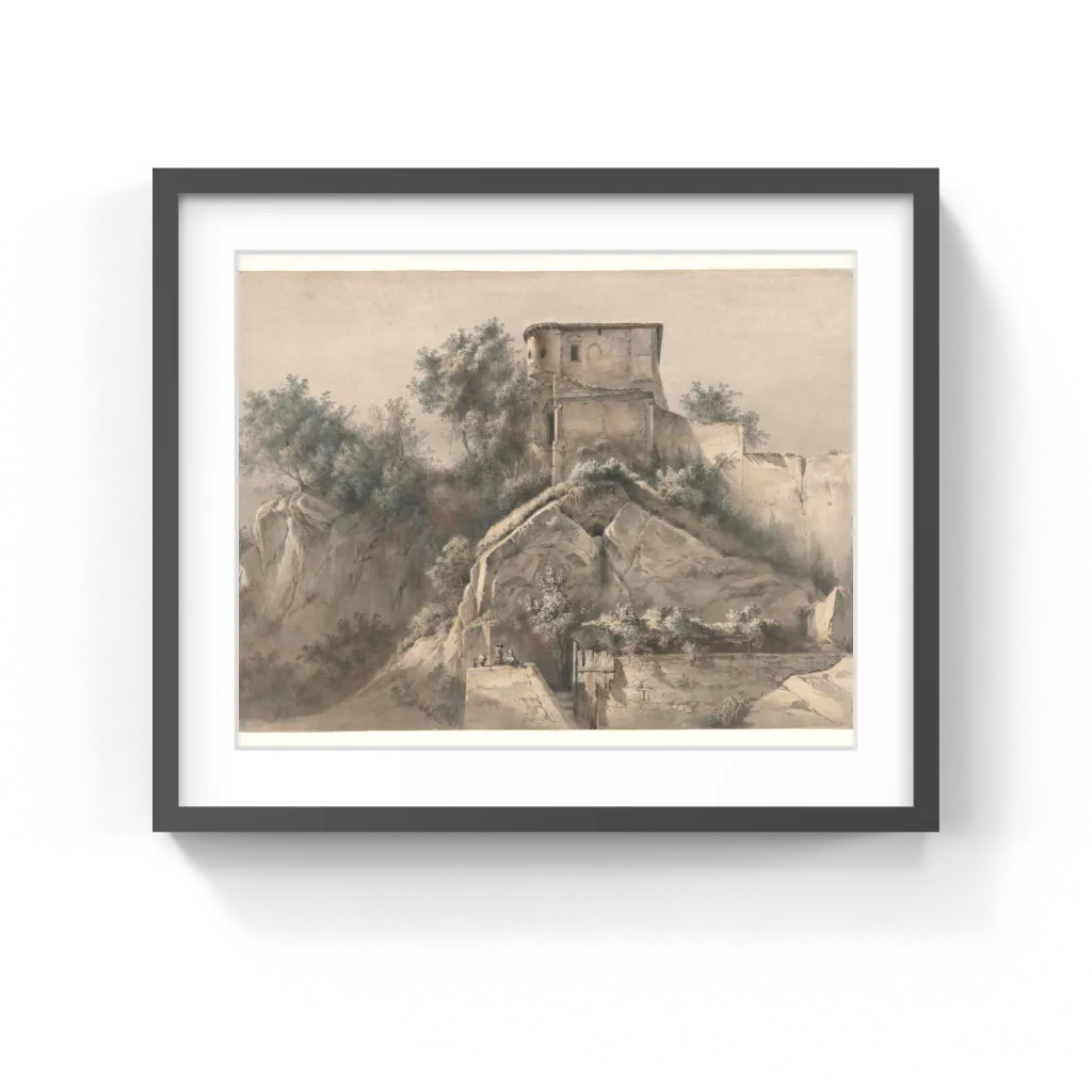 Jean-Jacques de Boissieu (French, 1736–1810) Jean-Jacques de Boissieu carefully framed his motif: an abandoned fortified house in Lyon known as Château Gaillard. Viewed from below, the ruins loom over the landscape; two minute figures in the foreground heighten the castle's imposing presence. Bathed in clear light, the two women are paired with two equally tiny pots of flowers, small symbols of a tamed and cultivated natural world. But for the most part, nature cannot be contained. Foliage and trees spring forth from the craggy inclines and ruins. Nature and the man-made intermingle and are brought closer together by a shared palette of browns and greens.