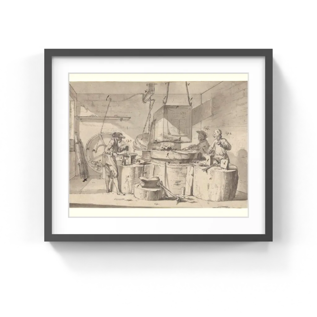 To maximize the view of every aspect of the nail-making process, Moreau carefully spread out the objects and workers across the composition. The sunlit room quite literally illuminates the profession and showcases Moreau's mastery of gray wash to describe the fall of light and shadows.