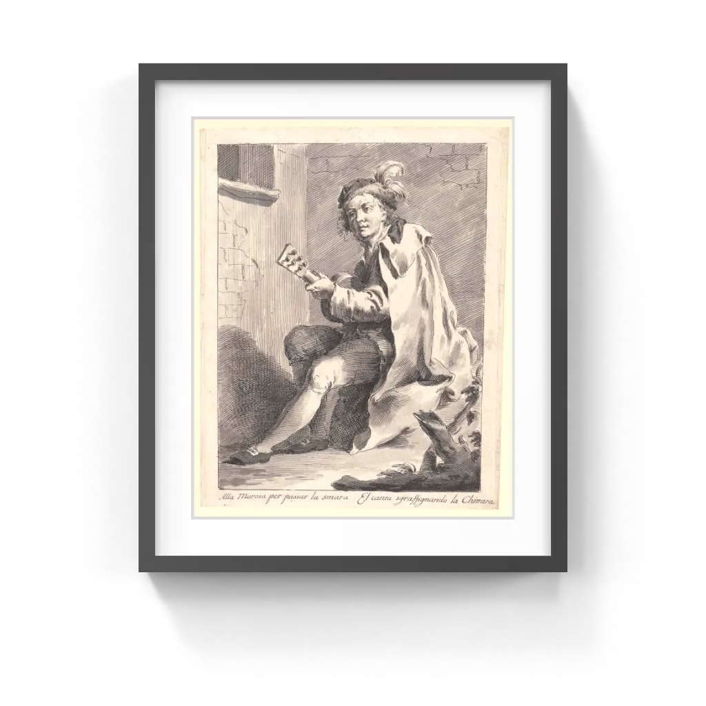 The object of his musical affection is not shown. But in the lower margin, an inscription in Venetian dialect narrates the man's actions. Loosely translated it reads: To relieve the beloved of her longing, he sings while scratching the guitar. The work's inscription seems innocent enough, but the words smara and chittara had rather vulgar meanings in Venetian slang of the period. The phallic guitar reinforces these salacious undertones. That the entire scene is placed within a lined border suggests that the drawing served as a design for a print and was perhaps part of a series of engravings illustrating bawdy Venetian sayings.