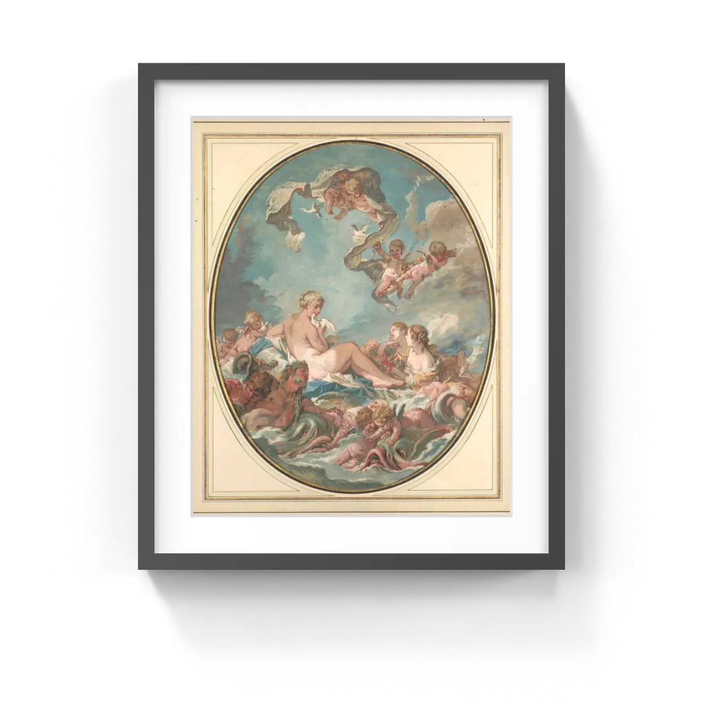 François Boucher (French, 1703–1770) Surrounded by admirers, a recumbent Venus clasps a white dove to her body. At her feet, a pair of naiads, or water nymphs, presents red coral and other sea treasures to the goddess of love. Two tritons, semi-human sea dwellers, vigorously vie for Venus's attention. One triton blows on his shell-trumpet while the other, wedged between his partner and a fantastical dolphin, empties water out of his horn. In both sea and sky, putti pay tribute to the goddess. Amid all this attention, Venus remains impassive, decidedly detached from the churning sea.