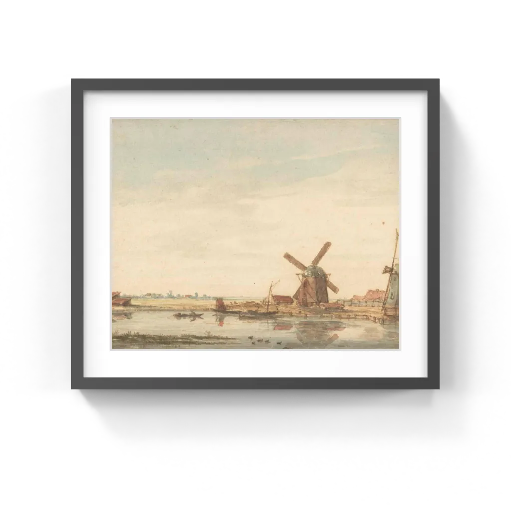 Antonie Erkelens (Dutch, 1774–1804) Erkelens applied colored wash to make his depiction of typical Dutch windmills and farmhouses more picturesque. Here the low horizon line and the use of atmospheric perspective capture the seeming endlessness of the Dutch terrain. The layering of colored wash together with the scintillating reflections on the water lend the sheet an exceptional freshness and vibrancy.