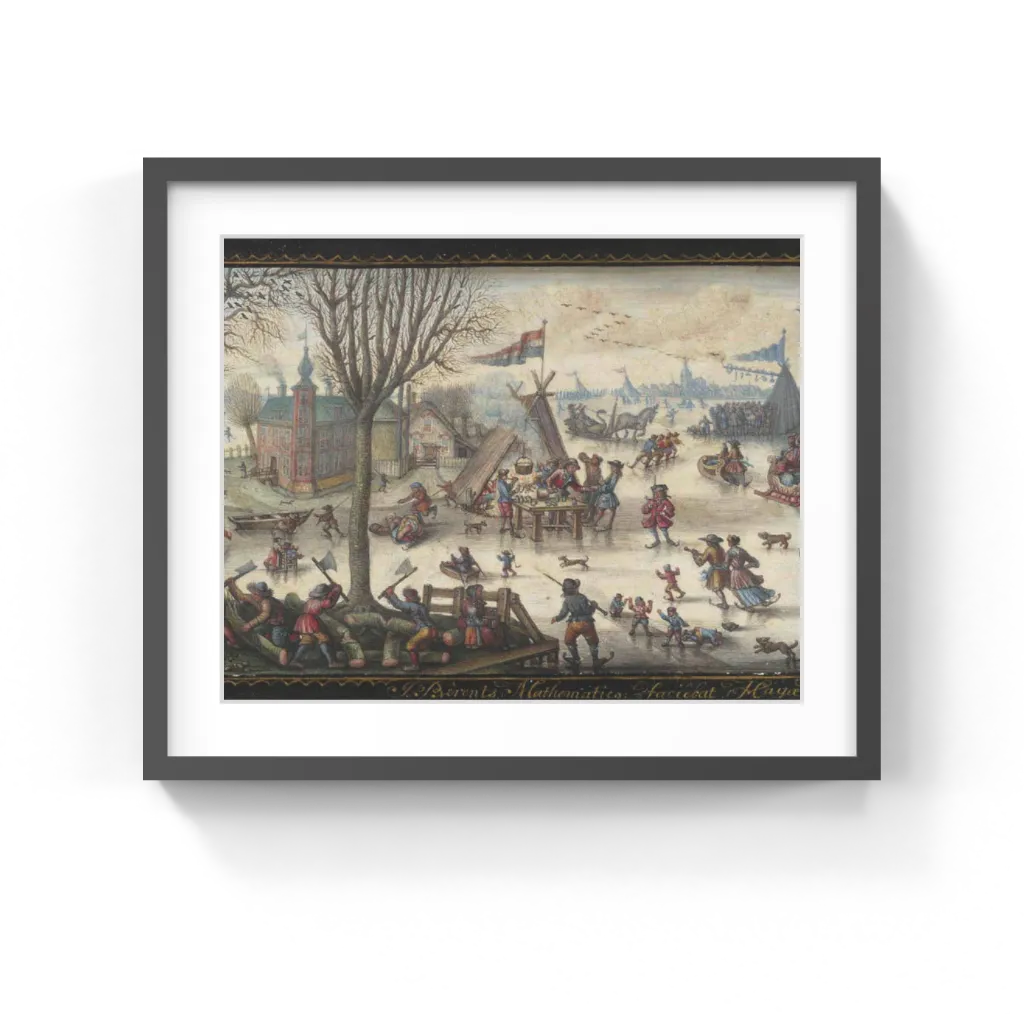 Jan Berents (Dutch, about 1679–after 1733) This miniature scene is cleverly composed to display both a vast sense of space, and a detailed view of life on the frozen canals. In the background, at right, the faraway towers of the Hague are visible. In the middle ground, wealthy citizens take sleigh rides, and line up to buy hot drinks from a vendor. In contrast with this, and the assorted frolicking dogs and children, the foreground features peasants hard at work cutting wood. Artist Jan Berents also creates atmospheric perspective with the considered placement of trees, flag poles, and church towers. At the base of the image, Berents adds his signature, and a reference to his unusual dual career as a mathematician.
