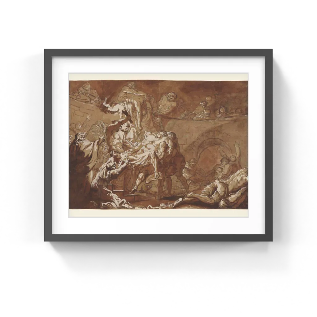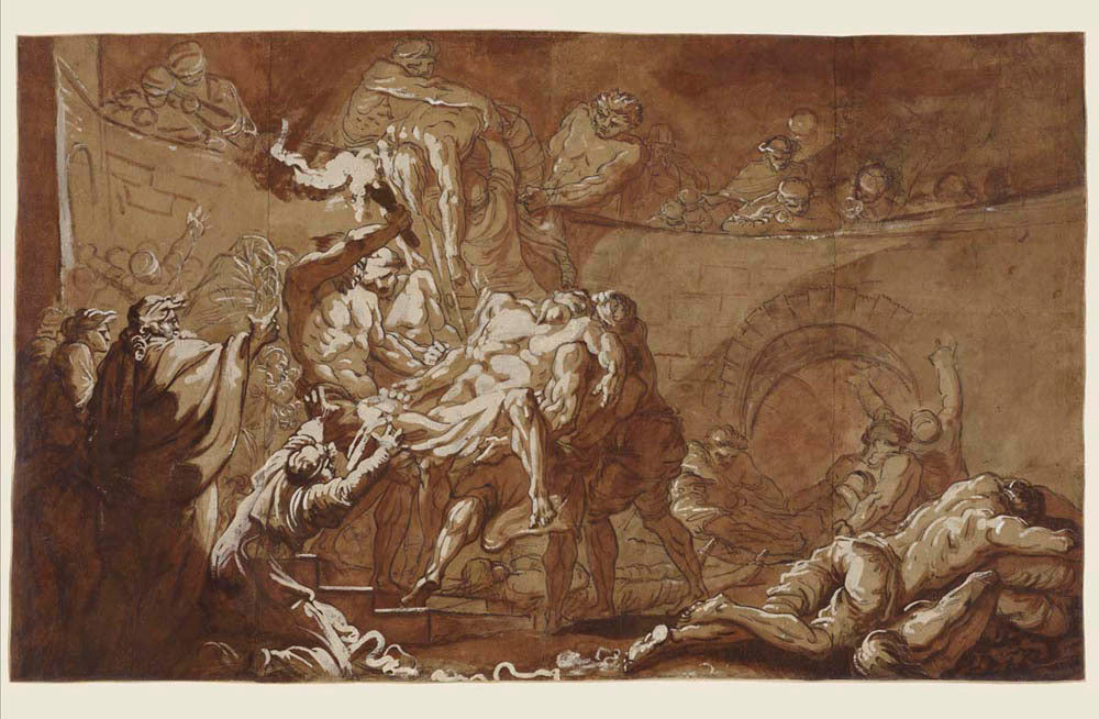 Jean-Baptiste Deshays (French, 1729–1765) Taken from the Book of Tobias (Tobias, I, 17-18 and II, 4-8) in the Vulgate - or late fourth-century canonical version of the Bible - the subject of this drawing is Tobias burying the Assyrian Jews who have been murdered by Niniveh. Despite the edict of King Sennacherib, which decreed that their dead be thrown outside the city walls, Tobit, the father of the young Tobias, secretly had the bodies of his fellow Jews buried under the cover of night. In doing so, he demonstrated more fear of divine law that commanded the Israelites to tend to their dead, than of the life threatening, unjust edicts of his earthly monarch.