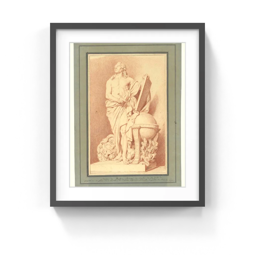 Augustin Pajou (French, 1730–1809) This finely executed drawing represents an important sculptural monument to the famous French naturalist Georges-Louis Leclerc, comte de Buffon (1707-1788). He is shown at full length, dressed with a toga, like an ancient philosopher, and with his hair long and his chest bare. He is holding a tablet in his left hand and a stylus in his right one, noting the phenomena of nature. A terrestrial globe is at his side; at his feet lie a lion, a snake, a dog and a bunch of corals, which are meant to serve as symbols of the vegetal and animal realms. The fact that the figure is standing on a base is an unmistakable indication that the drawing indeed represents a piece of sculpture. The drawing is an extremely faithful record of the monument, which precisely renders contours, relief and of the fall of light and shadow on the statue.