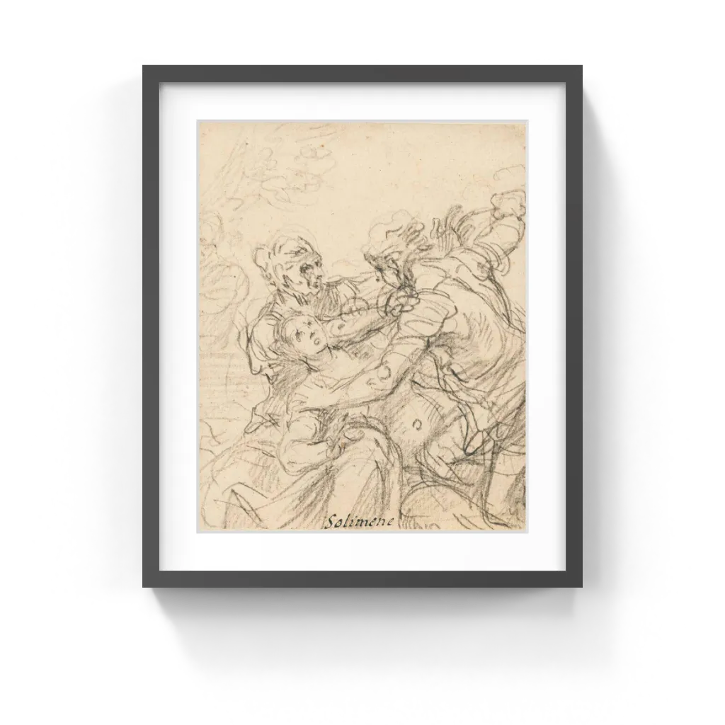 Francesco Solimena (Italian, 1657–1747) The drawing is a preparatory study for the painting of the same subject. Swiftly made in black chalk, the drawing explores the poses of the principal characters and their spatial relationships. Given the changes that exist between the drawing and the painting, it seems likely that the drawing was made at a relatively early stage in the creative process. No other preparatory drawings for this painting are known.