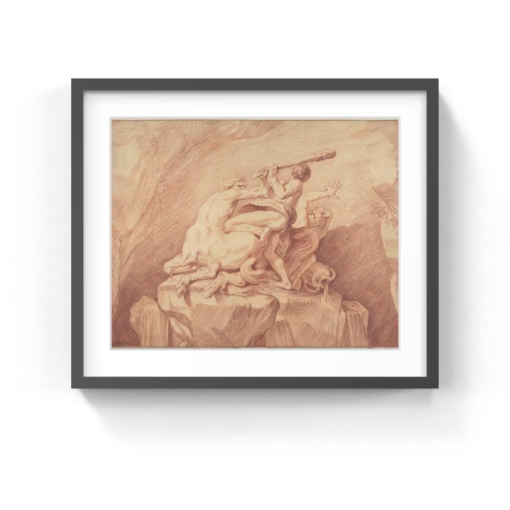 Edme Bouchardon (French, 1698–1762) Wielding his chalk with characteristic grace and precision, Bouchardon carved out his grappling figures from the shadows of an imagined grotto. At center, the hero Hercules--recognizable by a lion's skin worn around his waist and a knotty club in his grasp--straddles one thrashing centaur and prepares to deal the other a mighty blow. Though this scene is fantastical, the straining human and equine anatomy seems observed firsthand. Bold, decisive contour lines enclose each figure, setting the group apart, in crisp relief, from the rapid red chalk hatch-work of the rugged plinth and alcove. These rocky forms and the overturned jar at right confirm that the drawing represents an unrealized design for a grotto fountain.