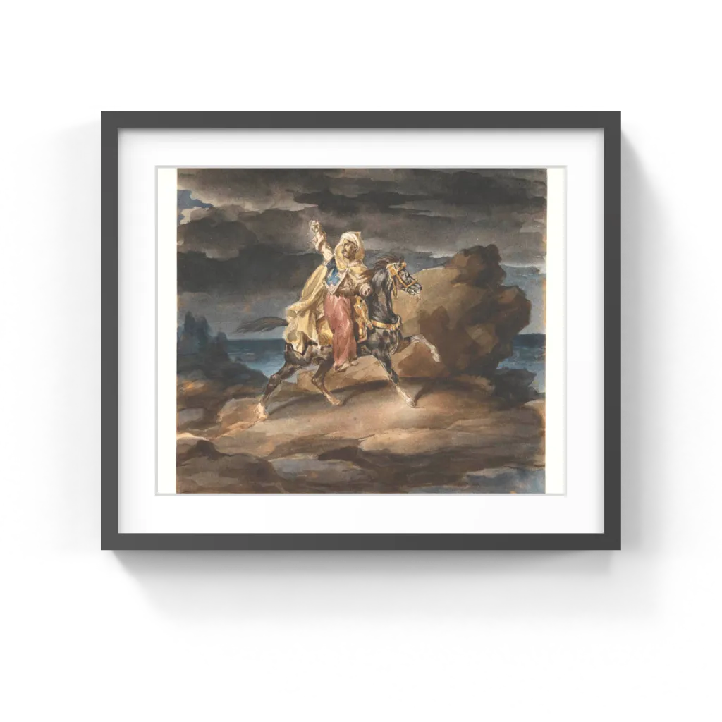 Taken from English Romantic poet Lord Byron's work of 1813, The Giaour: A Turkish Tale, these verses inspired the French Romantic painter Théodore Géricault to make this well-known watercolor. The dramatic story of an Arab Christian living as an infidel within his Muslim homeland tapped the vogue for Orientalism, which stemmed in part from Napoleon's recent campaigns in Egypt and Syria. Géricault's choice of subject matter was also affected by his passion for horses, which he often represented with great sensitivity.