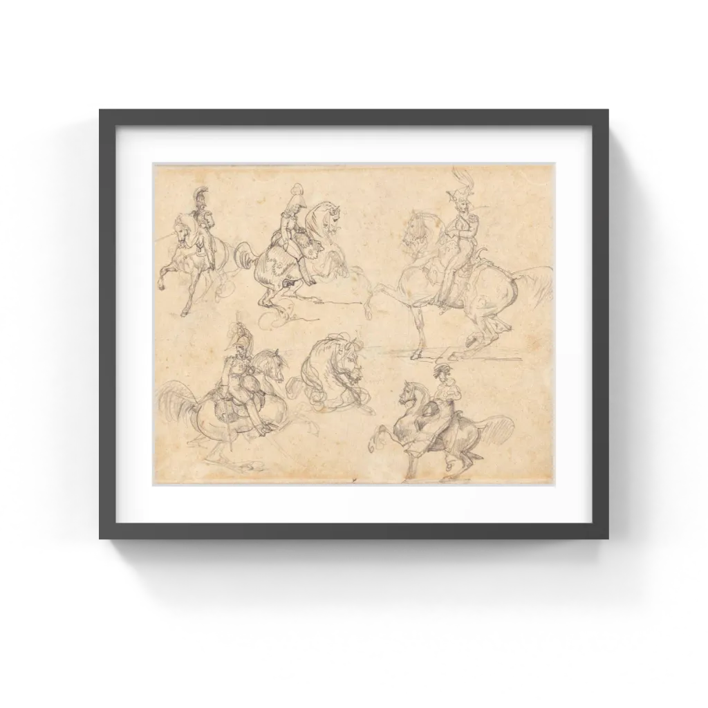 Théodore Géricault (French, 1791–1824) An enthusiastic horseman himself, Théodore Géricault was fascinated with the movement and power of these animals. In this page from one of his many dismantled sketchbooks, both the recto and verso contain numerous drawings of horses. On the front or recto, Géricault experimented with placing different liveried officers on the backs of rearing horses. Although he varied the uniform, helmets, and swords of the officers, the prancing animals set at various angles appear to have the most energy. Géricault's animated pencil moved vigorously across the sheet, creating flowing tails and prancing feet with quick, sure strokes.