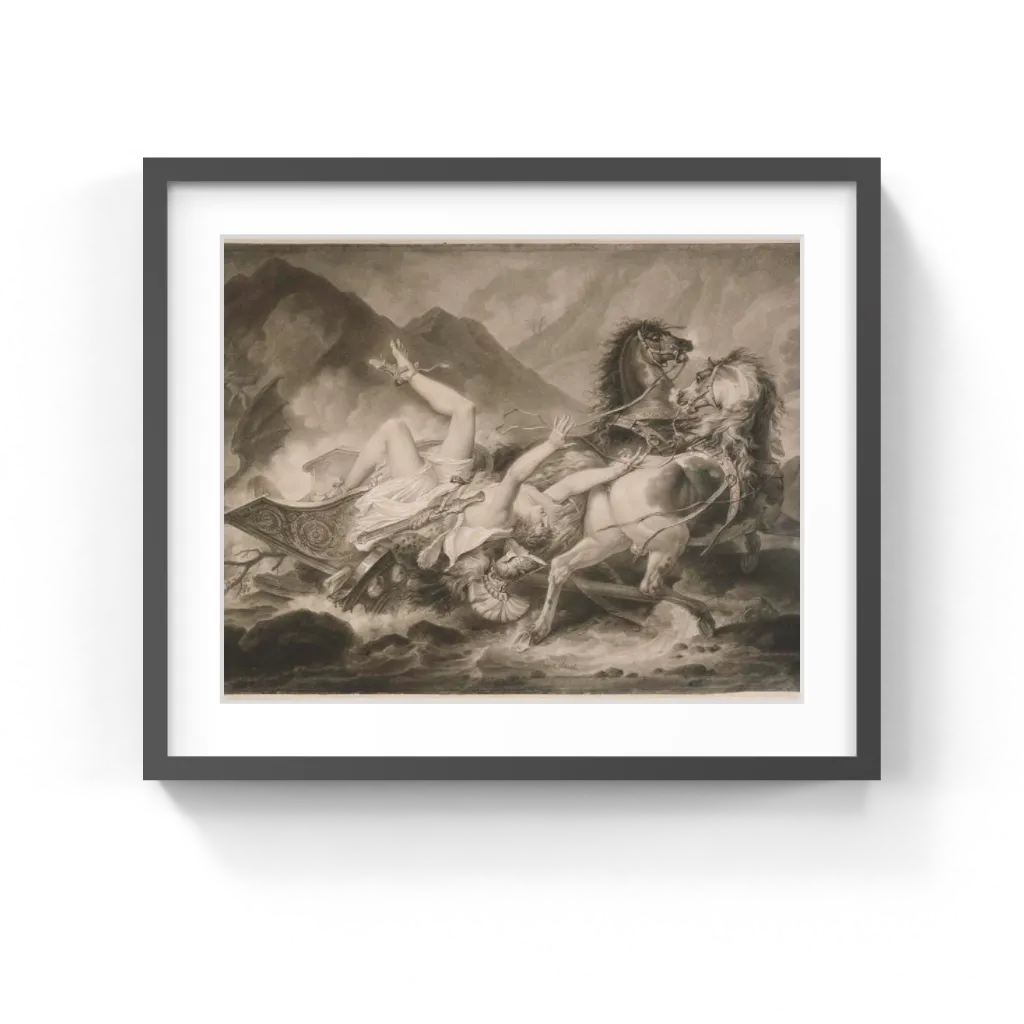 Hippolytos's stepmother Phaidra fell in love with him, but he rejected her affections. In revenge, she left a note accusing him of defiling her, and committed suicide. His enraged father Theseus banished Hippolytos and begged the gods to destroy him. As a result, the sight of a sea monster frightened the horses pulling Hippolytos in his chariot. Hippolytos lost control, and the horses dragged the hero to his death. Carle Vernet exhibited this drawing and its pendant, The Return from the Race,at the Salon of 1800, where they received wide acclaim. So popular were the scenes that another artist then produced engravings after them, which were exhibited at the Salon of 1808. The two drawings were auctioned in 1817, and did not reappear on the market until in the early 1990s.