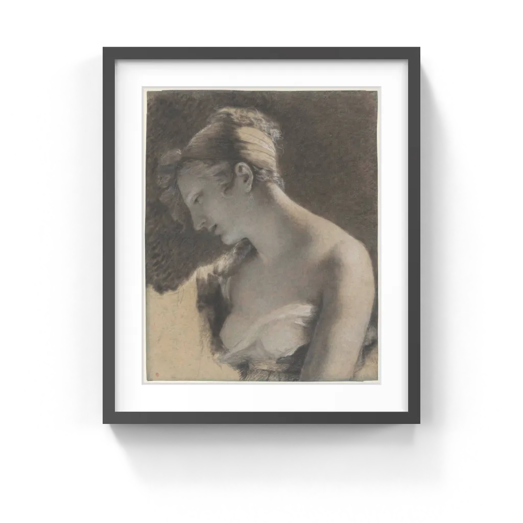 Pierre-Paul Prud'hon (French, 1758–1823) A nearly life-sized woman in antique dress gazes fondly at something held in her unfinished right arm. With her exposed breast, this ideal woman mingles dream and sensuality, anticipating Romanticism. The broad masses of light and shadow enhance the dreamlike effect.
