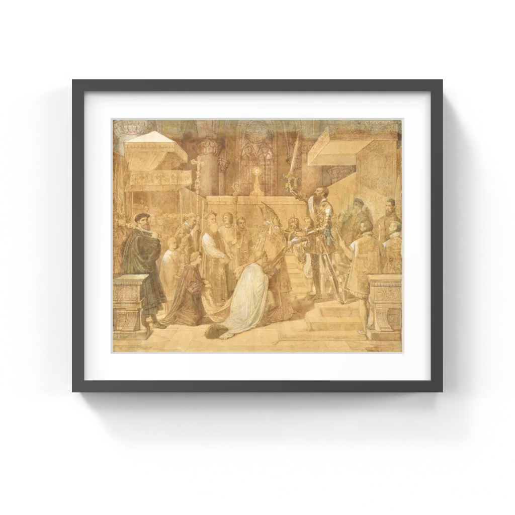 Jean-Auguste-Dominique Ingres (French, 1780–1867) Jean-Auguste-Dominique Ingres made this drawing either as a preparatory sketch or as a presentation drawing for a commission that he accepted in 1815 because he was financially strapped. The fourteenth Duke of Alba ordered a painting to commemorate the third Duke of Alba, also known as the "Butcher of Flanders." Here the infamous ancestor receives a hat and sword blessed by the pope for suppressing Protestant heresy in the Netherlands. As the governor-general of the Netherlands from 1567 to 1573, the duke had formed the Council of Troubles, nicknamed the "Council of Blood," which condemned some 12,000 Protestant rebels to death.