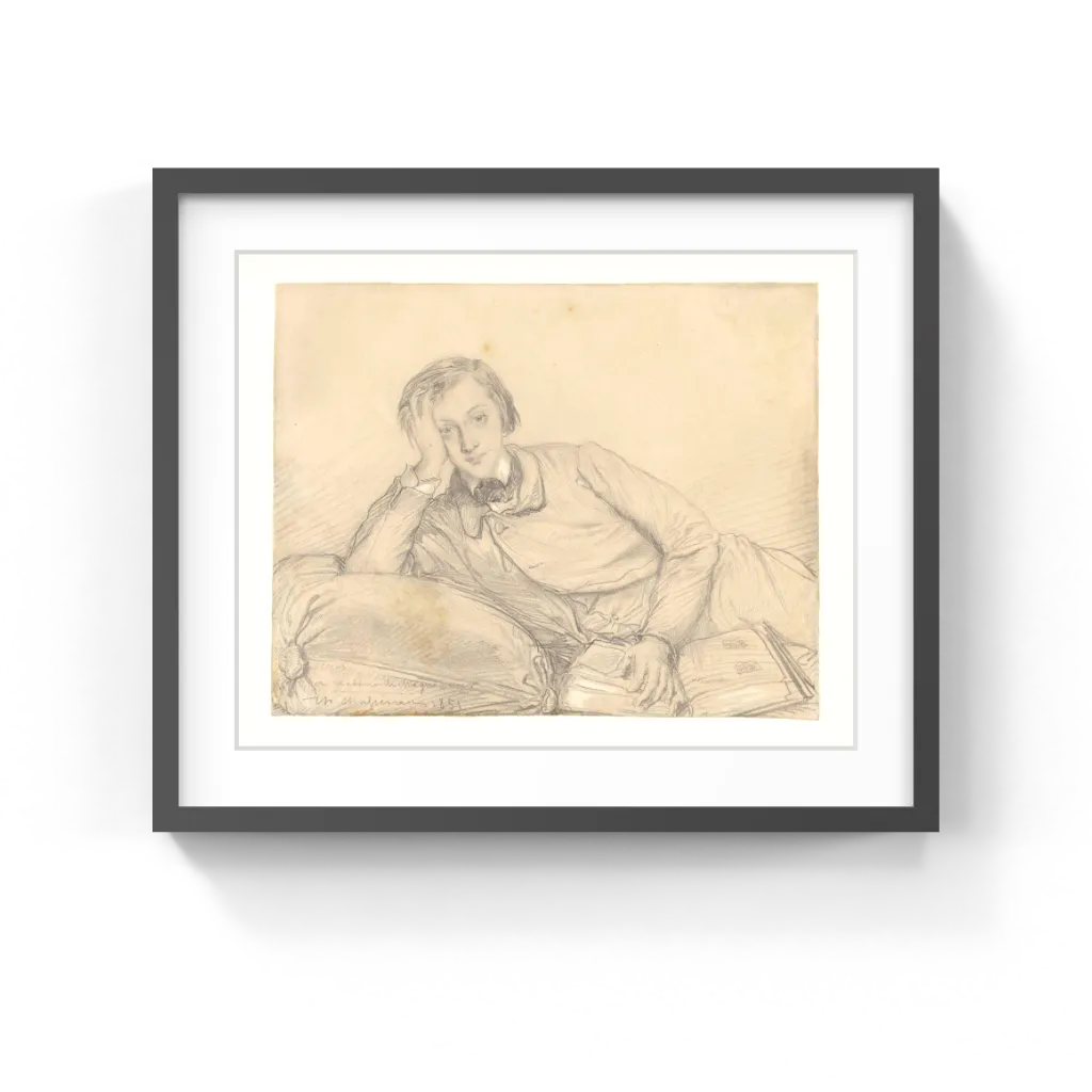 Théodore Chassériau (French, 1819–1856) An elegant young man with large, liquid eyes reclines languidly on a large cushion, pausing to look up from his reading. Raymond Henri de Staal de Magnoncourt, elder son of the Comte de Magnoncourt, was about sixteen years old when this drawing was made and dedicated to his mother in the bottom corner. His dreamy expression, rumpled yet elegant clothes, tousled hair, and the overall ambiance of artistic beauty and inspiration vividly capture the essence of the Romantic period.