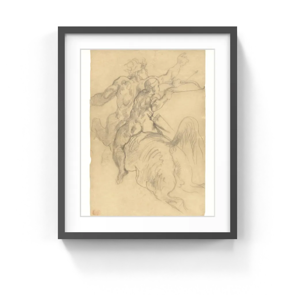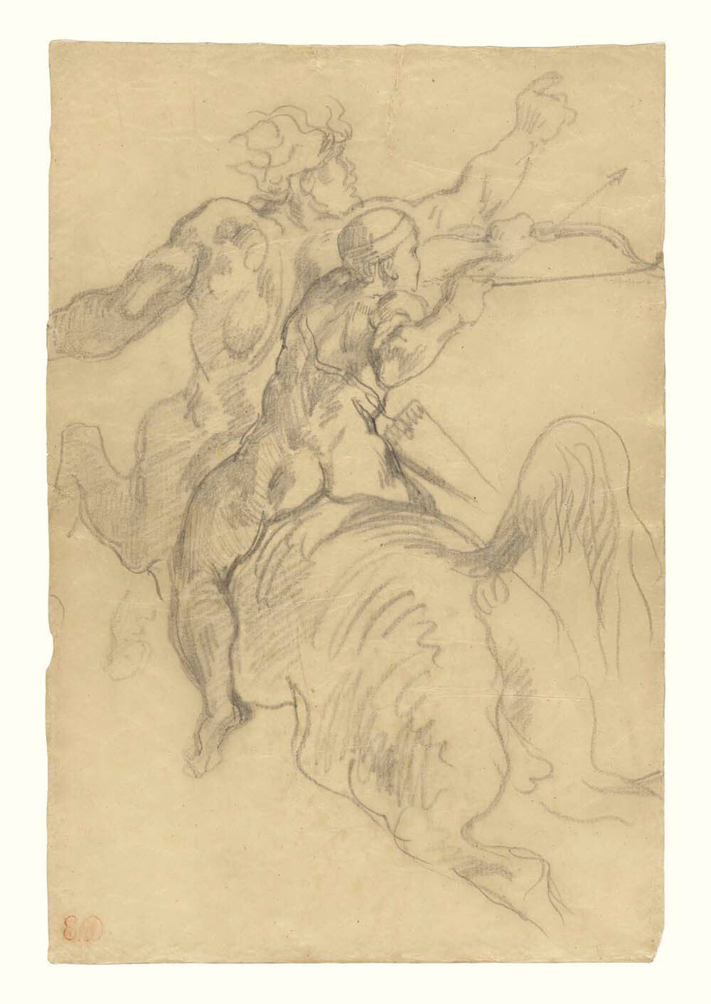 Eugène Delacroix (French, 1798–1863) With his right arm outstretched, the part-man, part-horse Chiron teaches Achilles to hunt with bow and arrow. The young pupil follows the centaur's guidance and directs his weapon toward a target beyond the sheet's top right corner. The two figures hold relatively similar poses, conveying the emotional bond between them. The drawing also suggests movement and power: as the pair turn to the upper right, Chiron's horse-body hurtles diagonally through the center of the composition.