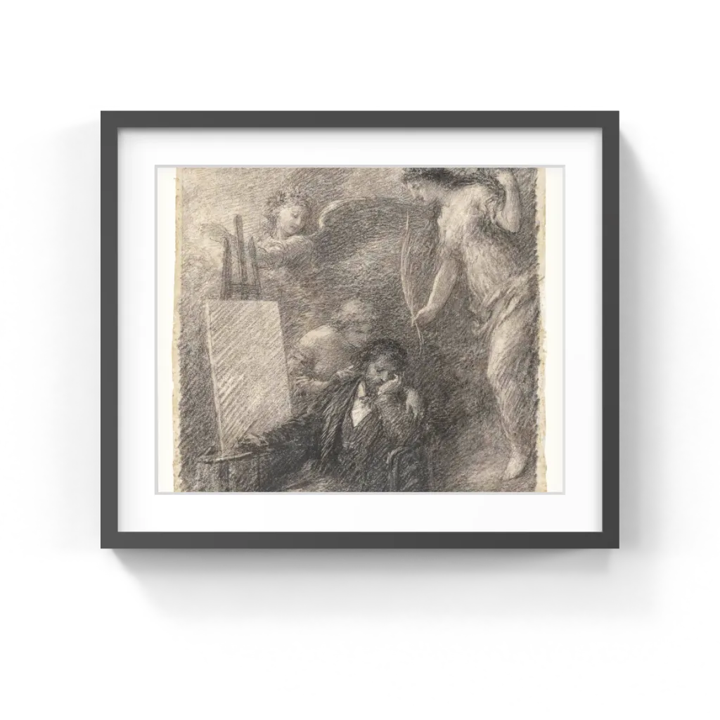 Henri Fantin-Latour (French, 1836–1904) Beside a blank canvas, a trio of fanciful female figures visits a dozing painter. One figure places a consoling arm around the artist and appears about to whisper words of inspiration in his ear. Another figure, upright at the right edge of the sheet, moves toward the artist with a palm frond in her left hand. An ethereal, winged figure floats through the background. In the lower right corner, Henri Fantin-Latour's signature suggests that the drawing was conceived as an independent work of art.