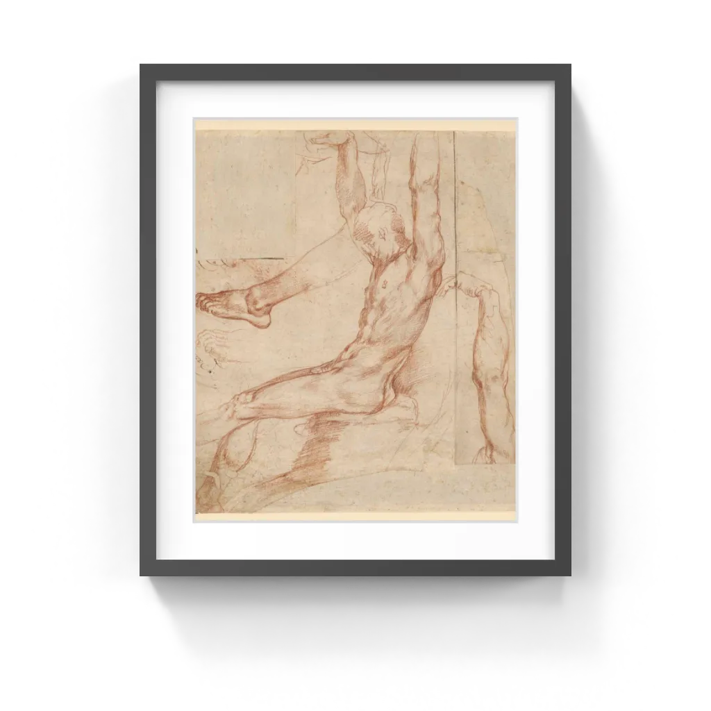 Polidoro applied the red chalk energetically, describing the taut muscles of the man's chest, arms, and thighs with strong diagonal shading. His head, in contrast, is loosely drawn, as the artist preferred to concentrate on the position and form of the body instead. The sharply pointed toes on the single foot provide a sharp contrast to the limp angle of his hand.