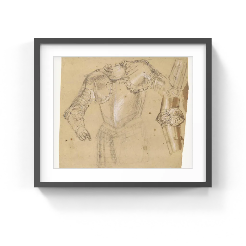 Although these studies do not match any known figures of men in armor by Paolo Veronese, either as portraits or within larger compositions, scholars suspect that Veronese or an artist close to him worked on this sheet. As in known Veronese drawings, this armor is presented as if it contains a gesturing man rather than as a uninhabited still-life form. The diagonal line of white highlights across the shoulder and stomach also closely correspond to a Veronese portrait of a man in armor. The rather broad, suggestive modeling, with sharper, darker chalk lines for emphasis, resembles other drawings by Veronese. With few other works for comparison, scholars remain hesitant about a firm attribution.