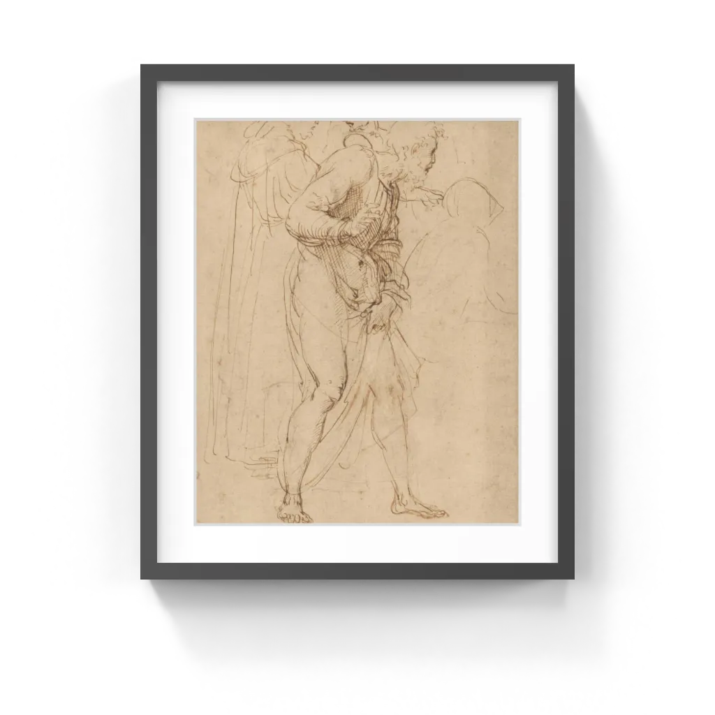 Raphael (Raffaello Sanzio) (Italian, 1483–1520) In this preliminary study for his Disputafresco in the Vatican, Raphael Sanzio rendered several of the figures with extraordinary clarity and economy. The central philosopher turning intently away from the viewer, the ghostly hooded figure on the right, and the men in animated discussion behind all appear in detail. Raphael varied the lines from the squiggles of the philosopher's hair to the straight folds of the standing monk's cloak, which seem to barely touch the page. This sheet also reveals the artist's thought process as he worked up the main figure from the nude, carefully manipulating the anatomical details so as to provide a believable structure and volume for the completely draped figure in the fresco.