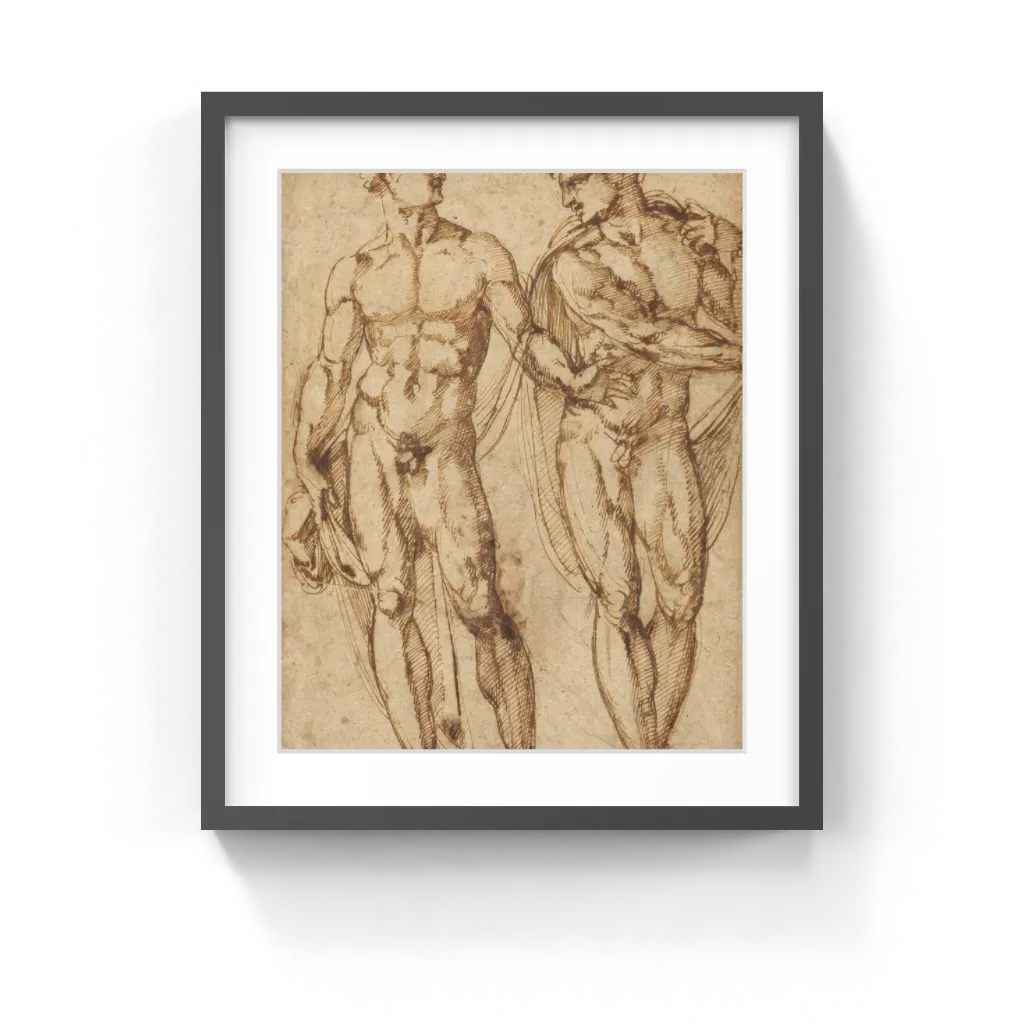 Baccio Bandinelli (Italian, 1493–1560) Baccio Bandinelli drew the outlines of each nude with strong, confident lines in pen and brown ink. Using parallel strokes of hatching and cross-hatching, he then indicated both the lighting and the volume of the forms, simply by varying the length and curve of the same strokes. Rippling muscles on the chest, as well as the figures' bulging thighs all appear with a few zigzagging strokes.