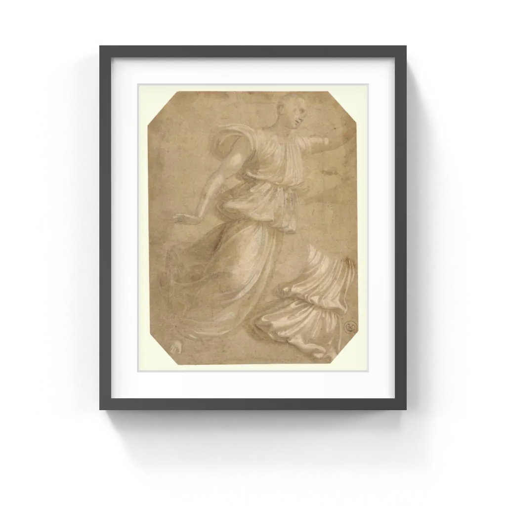 Innocenzo da Imola (Italian, 1485–1550) In depicting this angel, Innocenzo da Imola most importantly intended to analyze the effects of light and shadow on the drapery. Omitting such details as background, hair, and one foot, he focused on a flowing rhythm of drapery folds that is beautiful as an abstract design. The brown-tinted paper plays an active role, serving as the middle tone between the highlights in brushed-on white gouache and the spots of deepest shadow in brown wash and black chalk.