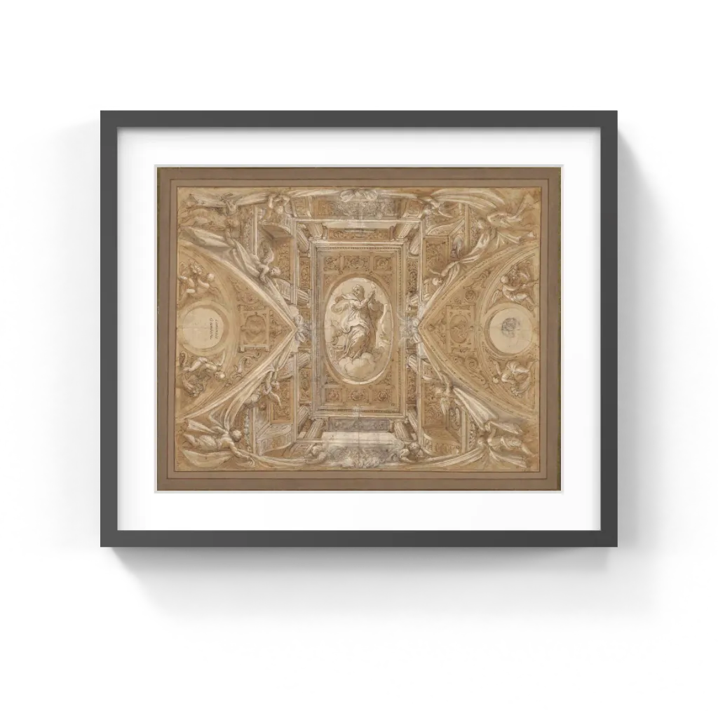Lattanzio Gambarra used this drawing as a preparatory study for the ceiling of a monastic church near the Italian town of Cremona. He and an architectural painter received the commission in 1568, but they probably never began the work since the whole ceiling was destroyed in 1573.